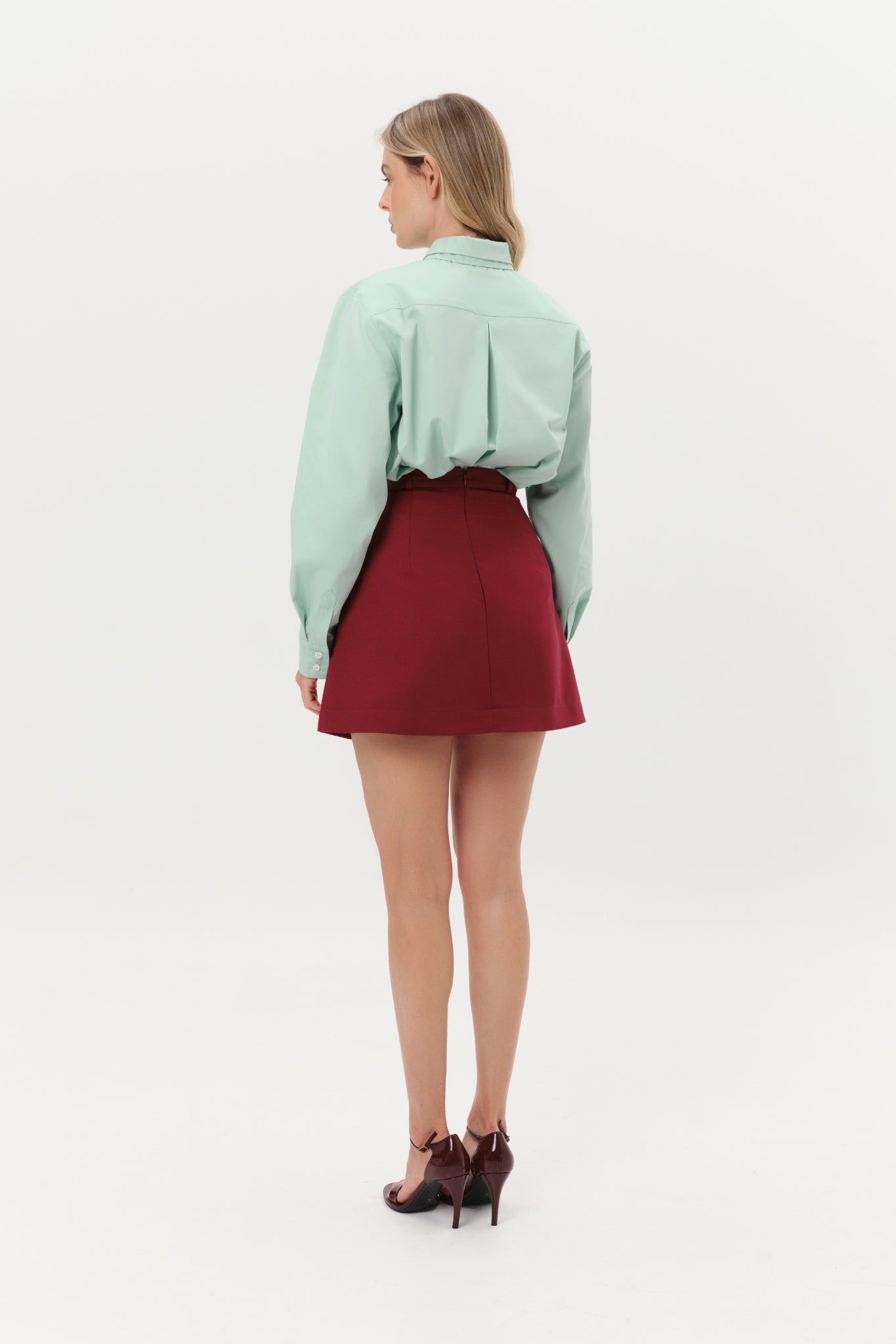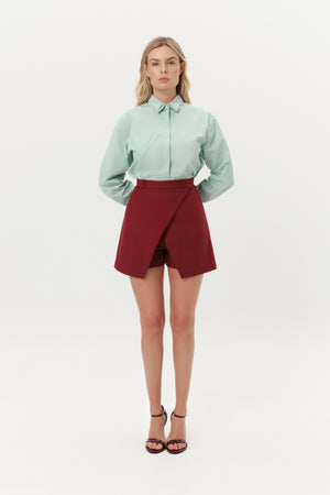 The AXIS Shorts are a masterclass in clever design, playing with lines and perspective. Featuring a bold, asymmetrical wrap-front panel, they offer the polished look of an architectural mini skirt with the hidden comfort and practicality of tailored shorts. Crafted from a beautifully structured, high-quality, textured wool, they are a true versatile statement piece.