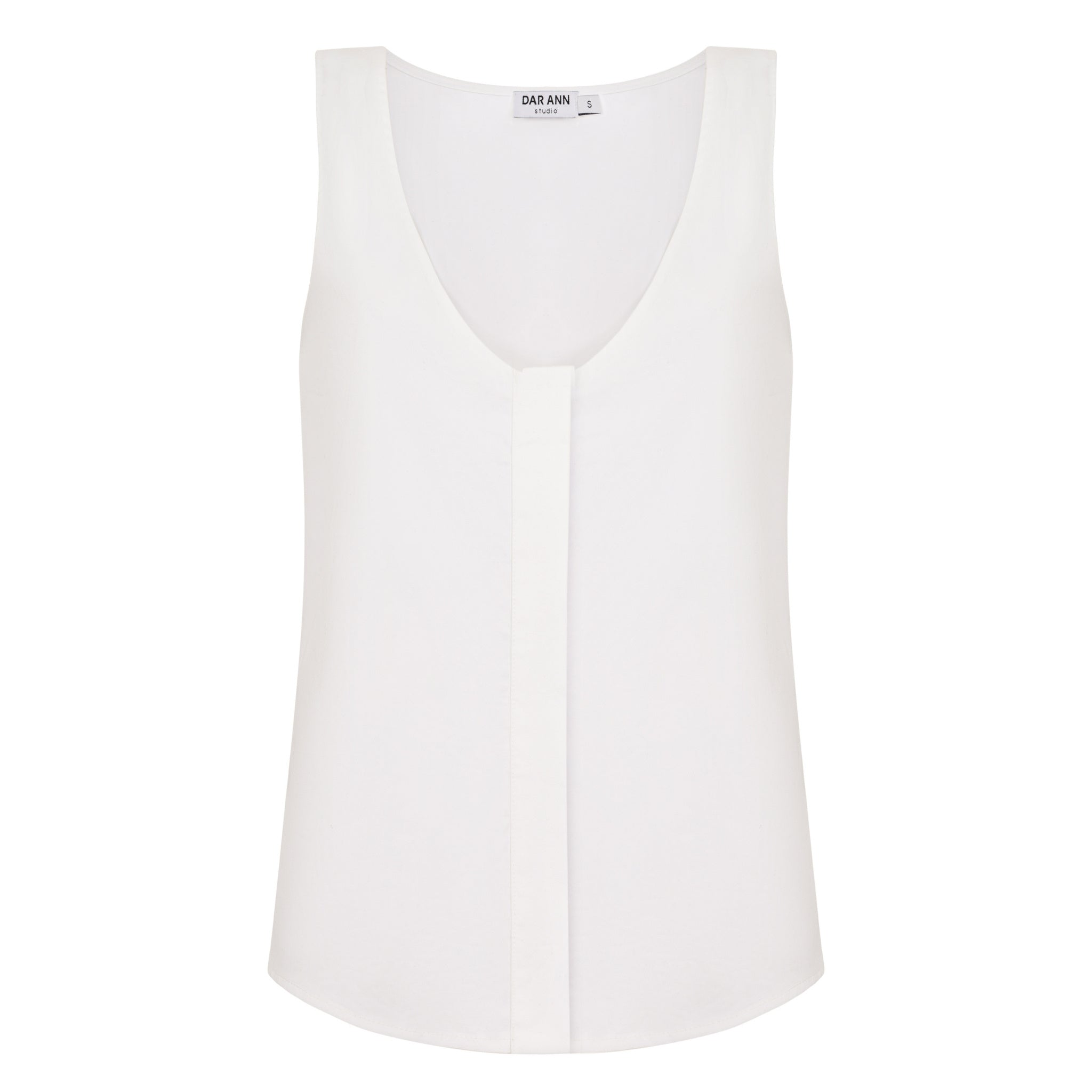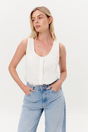 The PAPER CRISP Tank Top reimagines the essential summer staple for the office. Crafted from a structured, shirt-like fabric, it adds personality to a classic design. For versatile styling, the top can be completely unbuttoned to create different looks.