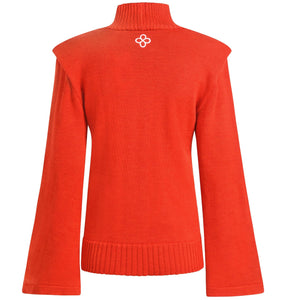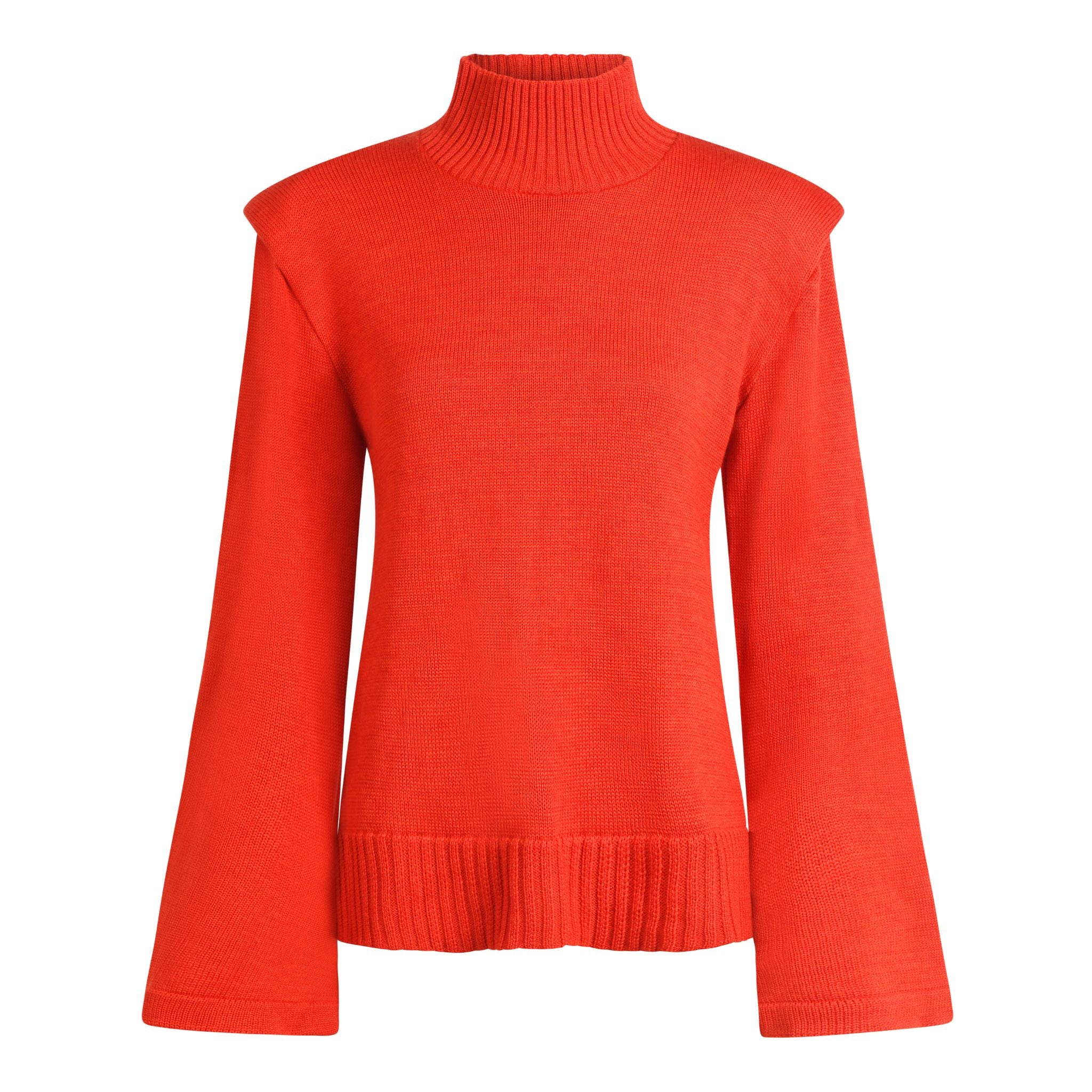 SELL WITH USGround your energy in bold elegance with the Root Chakra Turtleneck Sweater by Divine Harmonie. Crafted in France from 100% extra-fine merino wool, this striking red pullover channels stability and strength through a refined, sculptural silhouette. With its structured shoulder pads, wide flared sleeves, and 9cm ribbed turtleneck, the design fuses spiritual symbolism with high-fashion minimalism.