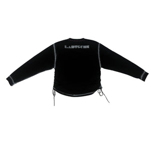 The MINDBLOWN x BTSA LADYGUNN Long Sleeve Tee pairs a deep black silhouette with bold pink graphic paneling and a LADYGUNN sleeve logo. It features subtle distressing and adjustable side ruching for customizable shape. Crafted from repurposed and deadstock materials. Part of the limited DOORS x LADYGUNN NYFW drop.