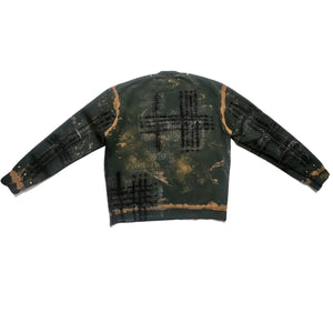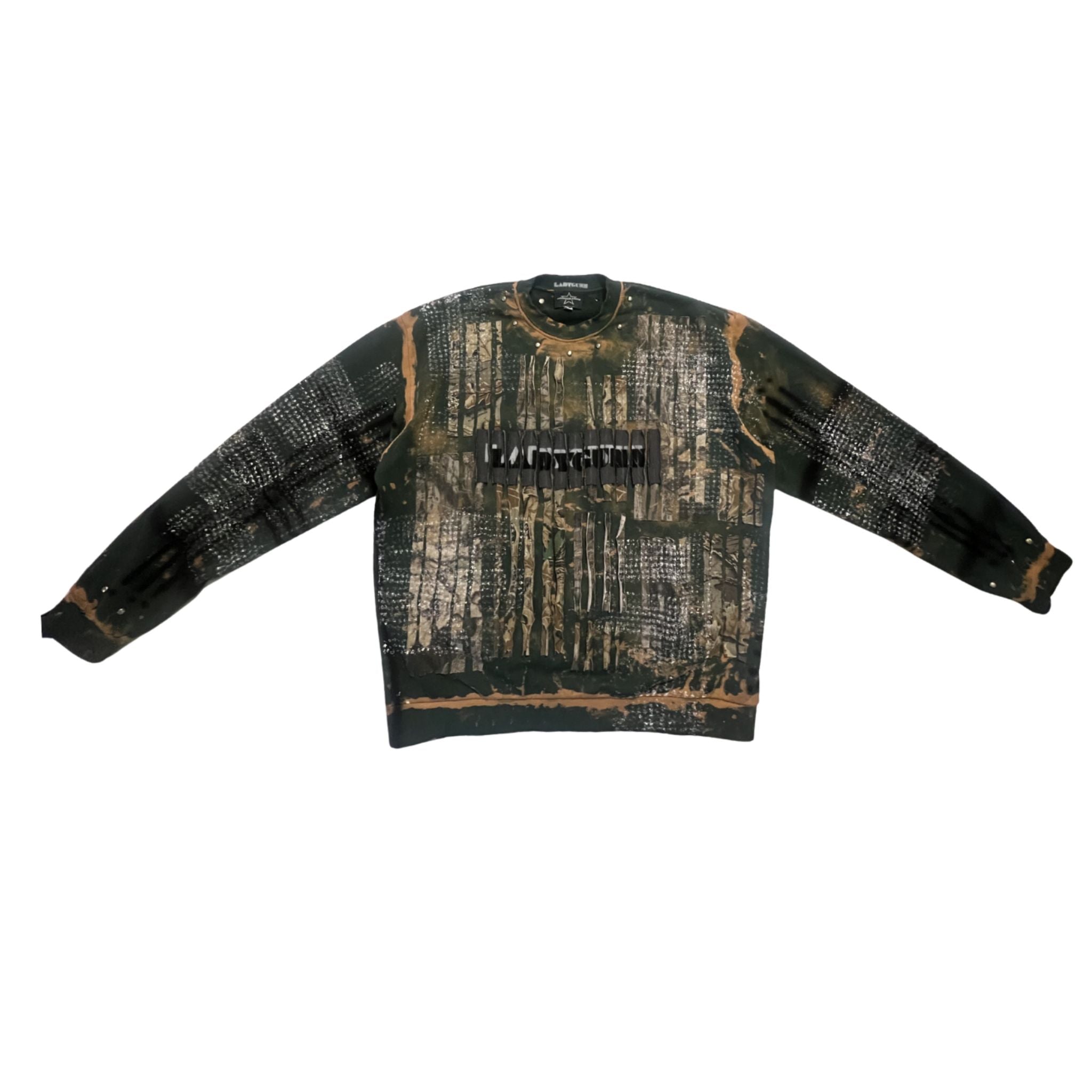 The MINDBLOWN x BTSA x LADYGUNN Real Tree Pullover redefines camouflage with an art-driven edge. Cut in a relaxed silhouette, this green camo sweatshirt features an abstract Real Tree - inspired print layered with distressed paint effects and bold graphic detailing across the chest. The washed, textured finish gives each piece a one-of-a-kind feel - balancing streetwear attitude with collectible design. Part of the limited DOORS x LADYGUNN NYFW drop.