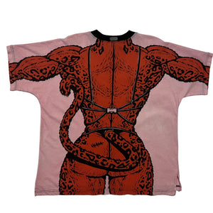 The Buff Lady G Tee in Pink/Black from HESTAVERSE x LADYGUNN features a bold, wraparound feline bodybuilder graphic on a washed pink base. The oversized silhouette amplifies its comic-meets-culture impact - fearless, disruptive, and impossible to ignore. Part of the limited DOORS x LADYGUNN NYFW drop.