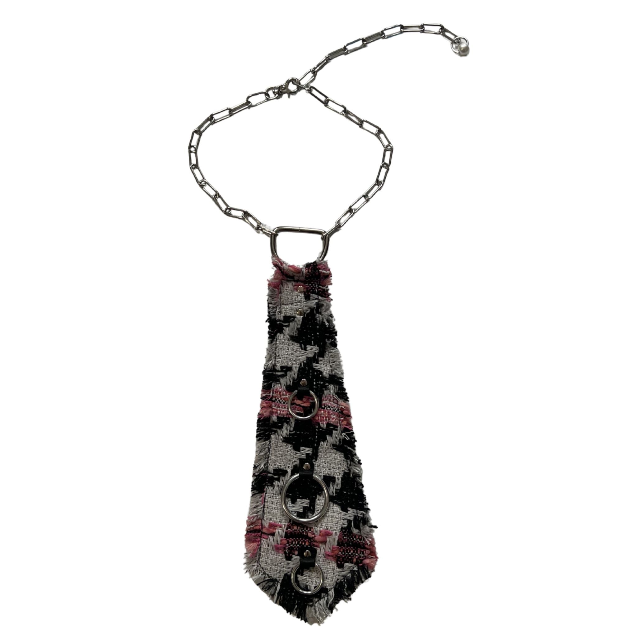 The Necktie Necklace from HESTAVERSE x LADYGUNN transforms classic pink-and-black plaid into a deconstructed statement accessory. Finished with metal ring hardware and a silver-tone chain closure, it blurs the line between neckwear and jewelry. Part of the limited DOORS x LADYGUNN NYFW drop.