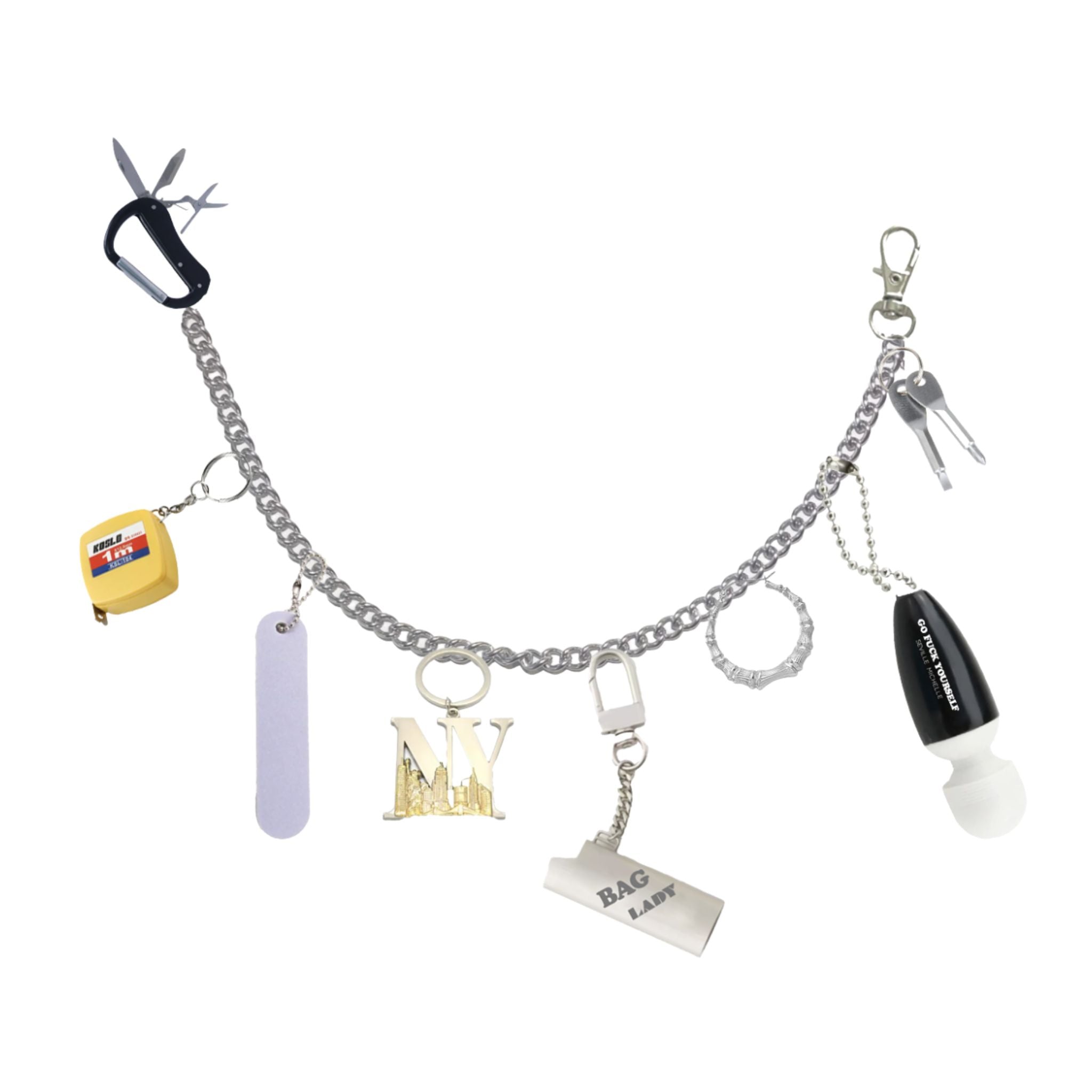 The SM x LADYGUNN Bag Lady Charm features a silver-tone chain with eclectic NYC-inspired pendants, including a bold NY charm and playful graphic details. This limited-edition accessory adds instant downtown attitude to any bag. Part of the limited DOORS x LADYGUNN NYFW drop.