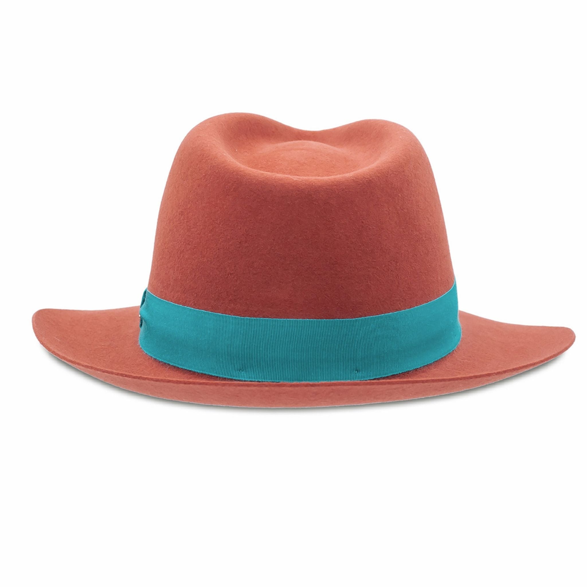 SELL WITH USDrop is a medium brim hat typical of Doria 1905. This particular style is made of Smooth Lapin felt in a bauxite red color and finished with a refined grosgrain belt in the color turquoise blue.