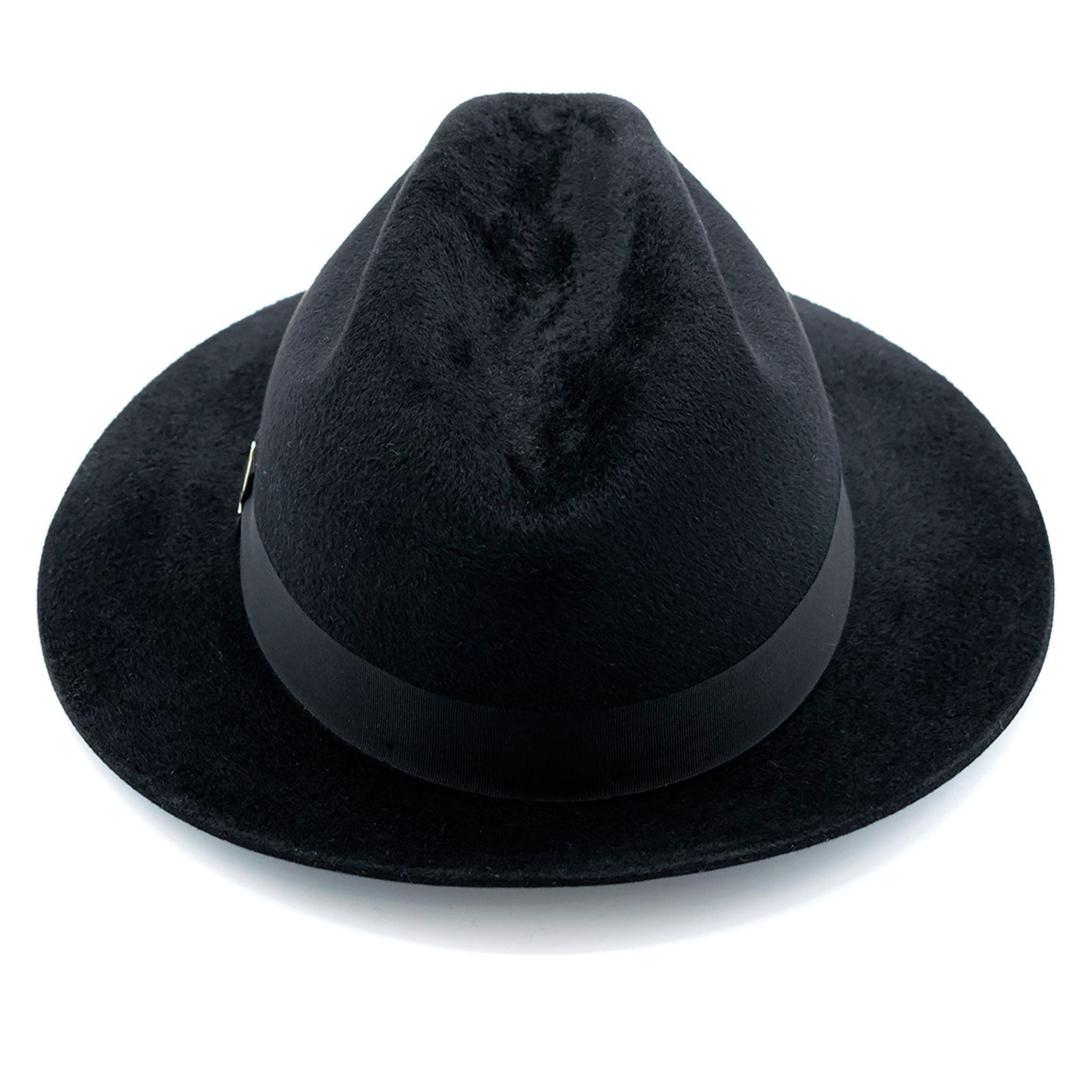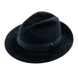 SELL WITH USThis Fedora hat made of lapin felt with Velour finish stands out for its superior quality and refined appearance. The medium-sized brim offers an elegant and contemporary touch. Made in a classic black, it is complemented by a tone-on-tone grosgrain band and a golden brass logo, which enhances its look.