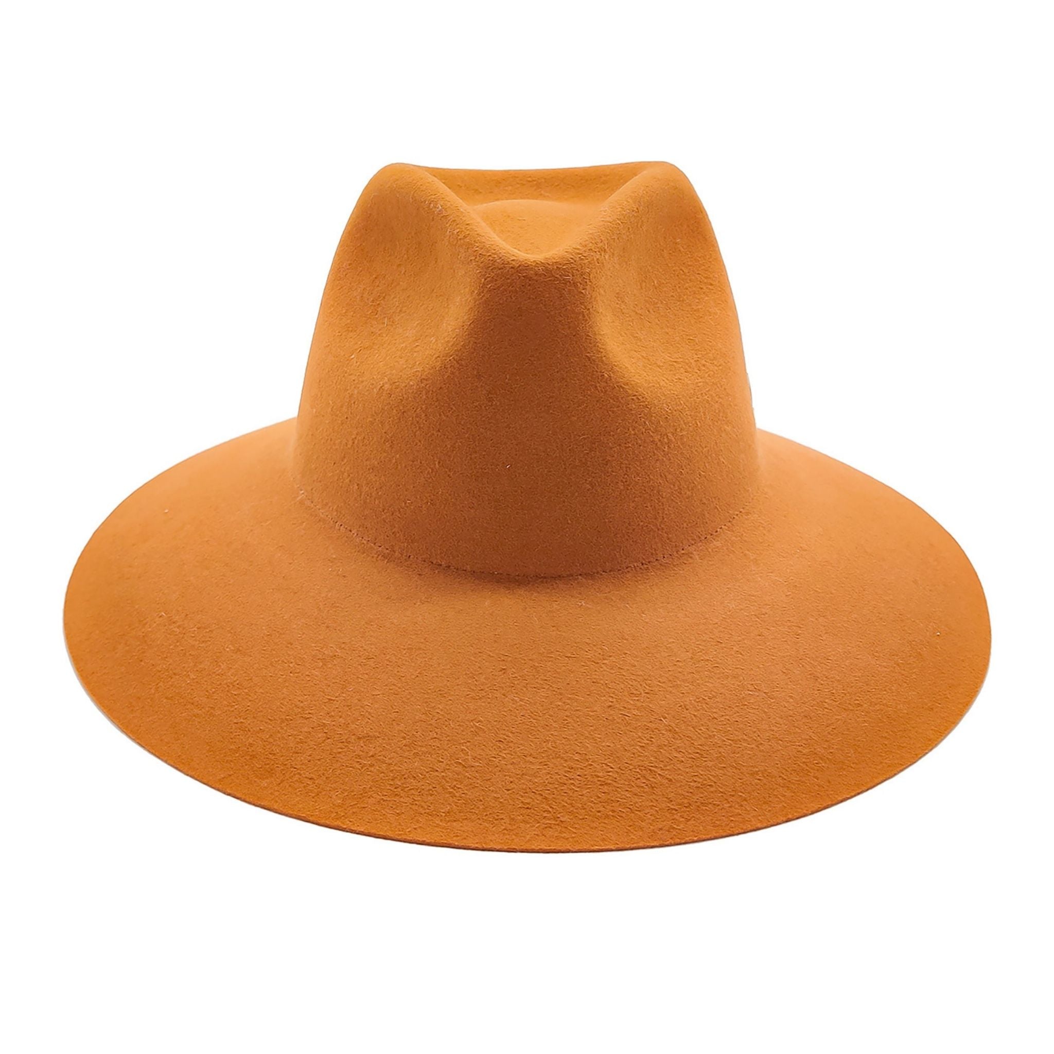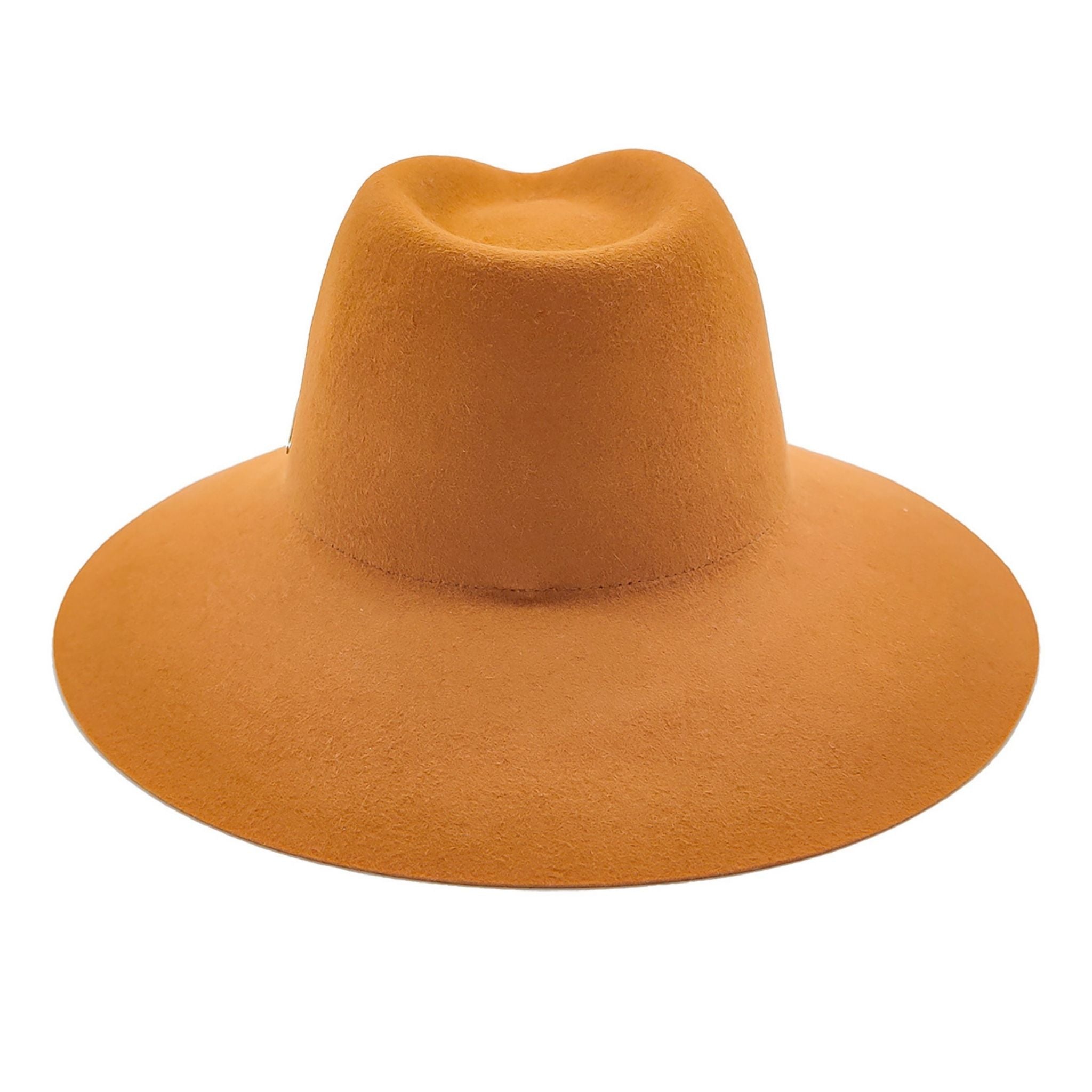 SELL WITH USWide-brimmed Drop hat made of Smooth finish Lapin felt in a deep, intriguing turmeric color. Simple, clean and straightforward. It represents the "naked" version of the iconic "Drop" with a large Brim