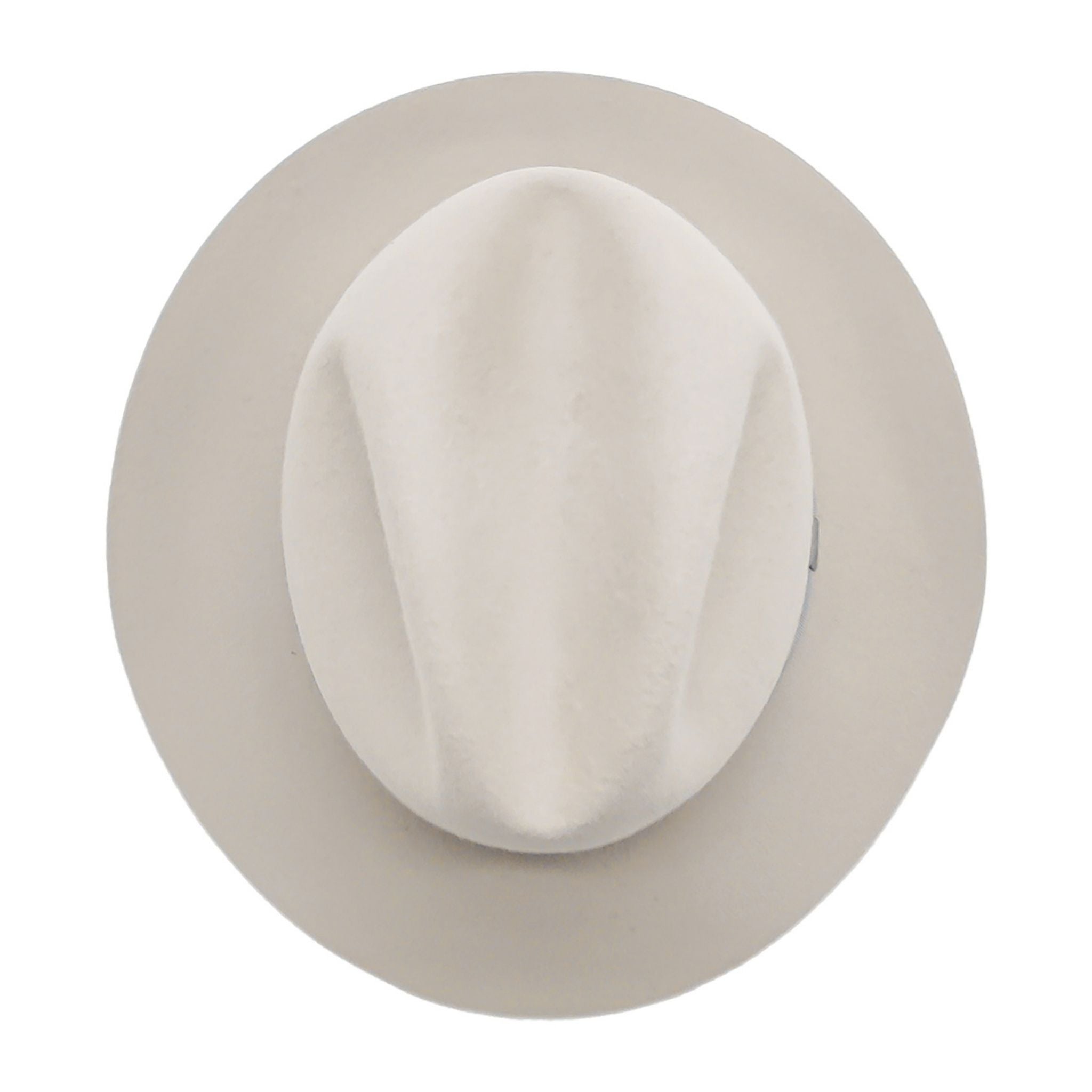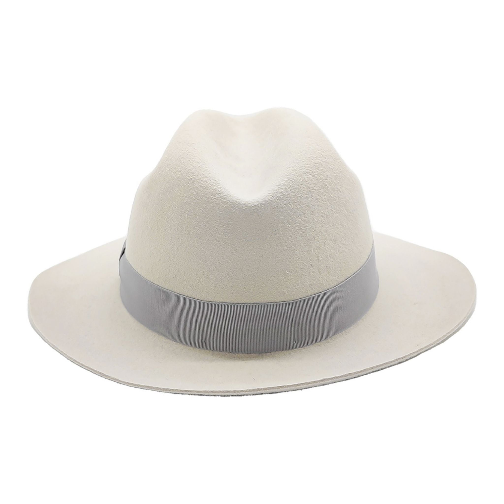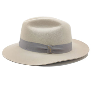 SELL WITH USOur Roberto is a Fedora hat with a medium-sized brim made of a fine smooth Lapin felt finishing. Developed in a light, elegant sand color and a cement-colored grosgrain band. Definitively charming, a great classic for hat lovers and an iconic item from Casa Doria. It can be worn on any occasions, from the most formal to the informal ones.
