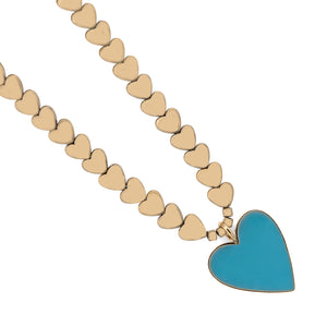SELL WITH USCalmness Blue Heart Pendant Gold Heart Beaded Necklace features an 18k gold-plated blue enamel heart pendant and gold hematite heart-shaped beads. Symbolizes tranquility and elegance.