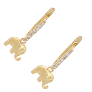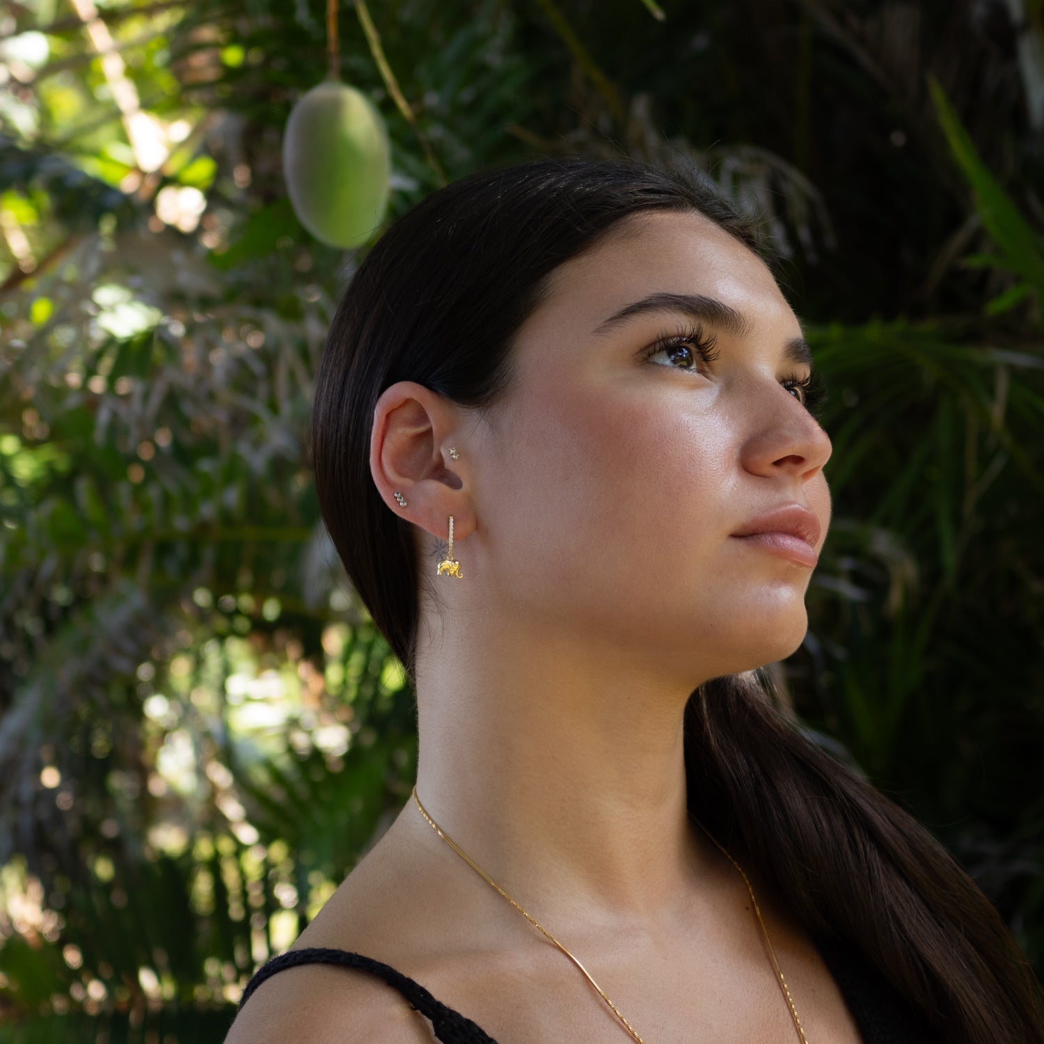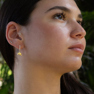 A petite token of giant fortune, the Dainty Gold Lucky Elephant Earrings by Ebru Jewelry are designed to bring wisdom and protection to your daily routine. These huggie-style hoops are crafted from 14k gold-plated sterling silver (vermeil) and feature a delicate elephant charm—an ancient symbol of strength, luck, and stability. Each charm is dusted with micro-pavé CZ stones that catch the light with every turn of the head. The secure hinged closure makes them effortless to put on and comfortable enough to sleep in. Wear them as a solo statement of positivity or stack them in a second piercing for a curated, eclectic earscape.