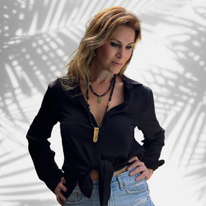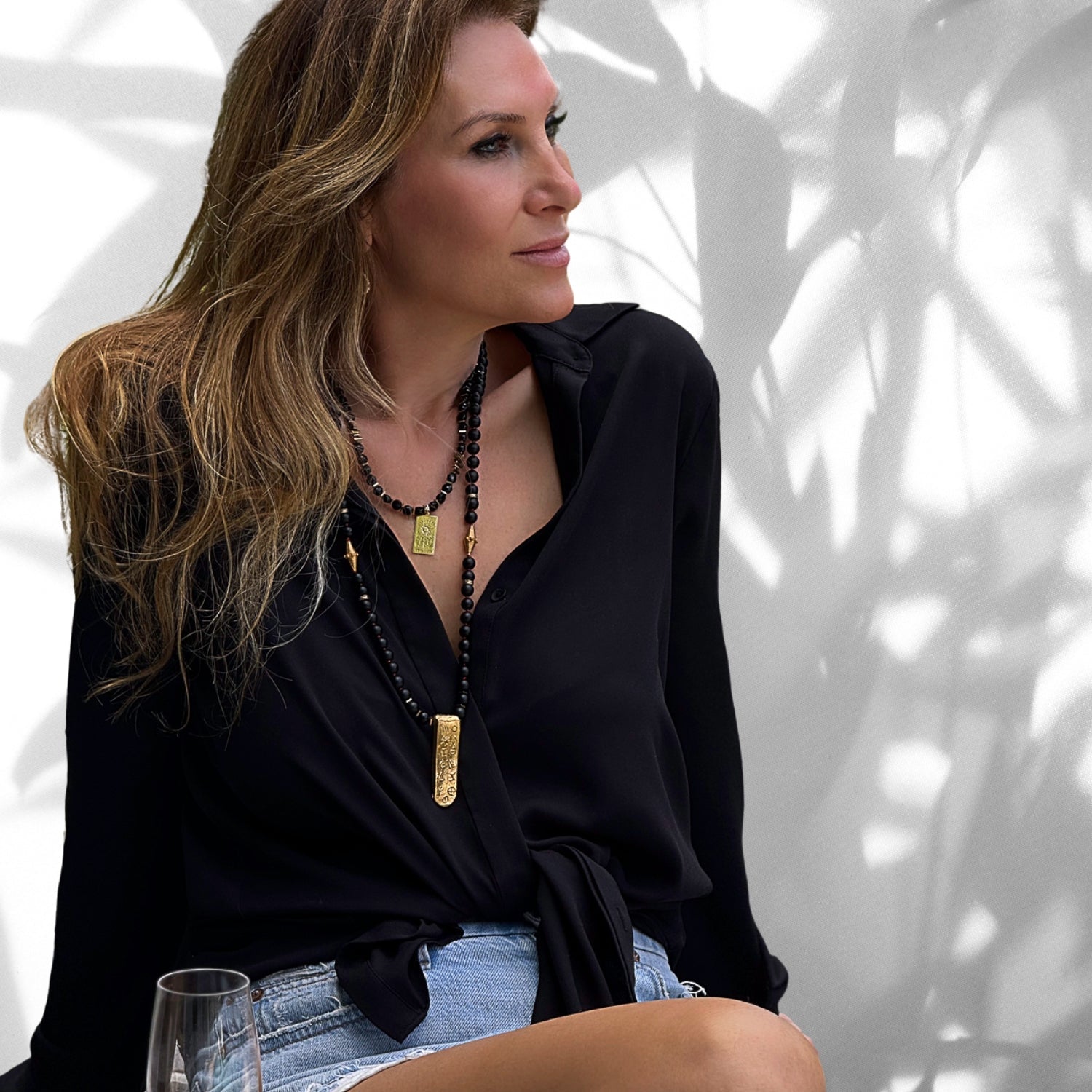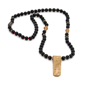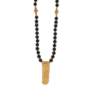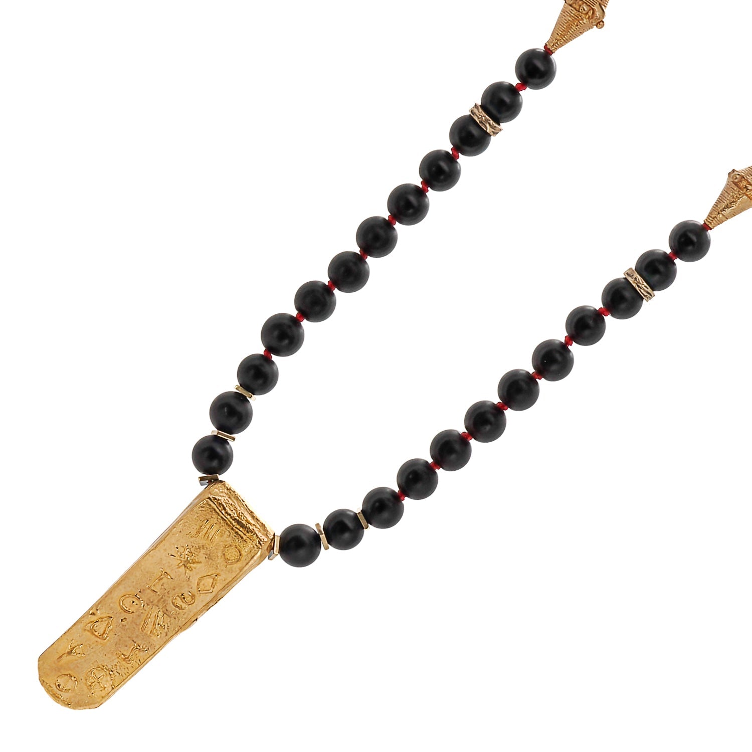 SELL WITH USGold Egyptian Symbols Unique Pendant Black Onyx Beaded Necklace features matte black onyx beads and a handmade Egyptian symbols pendant. Combines tradition and modern style.