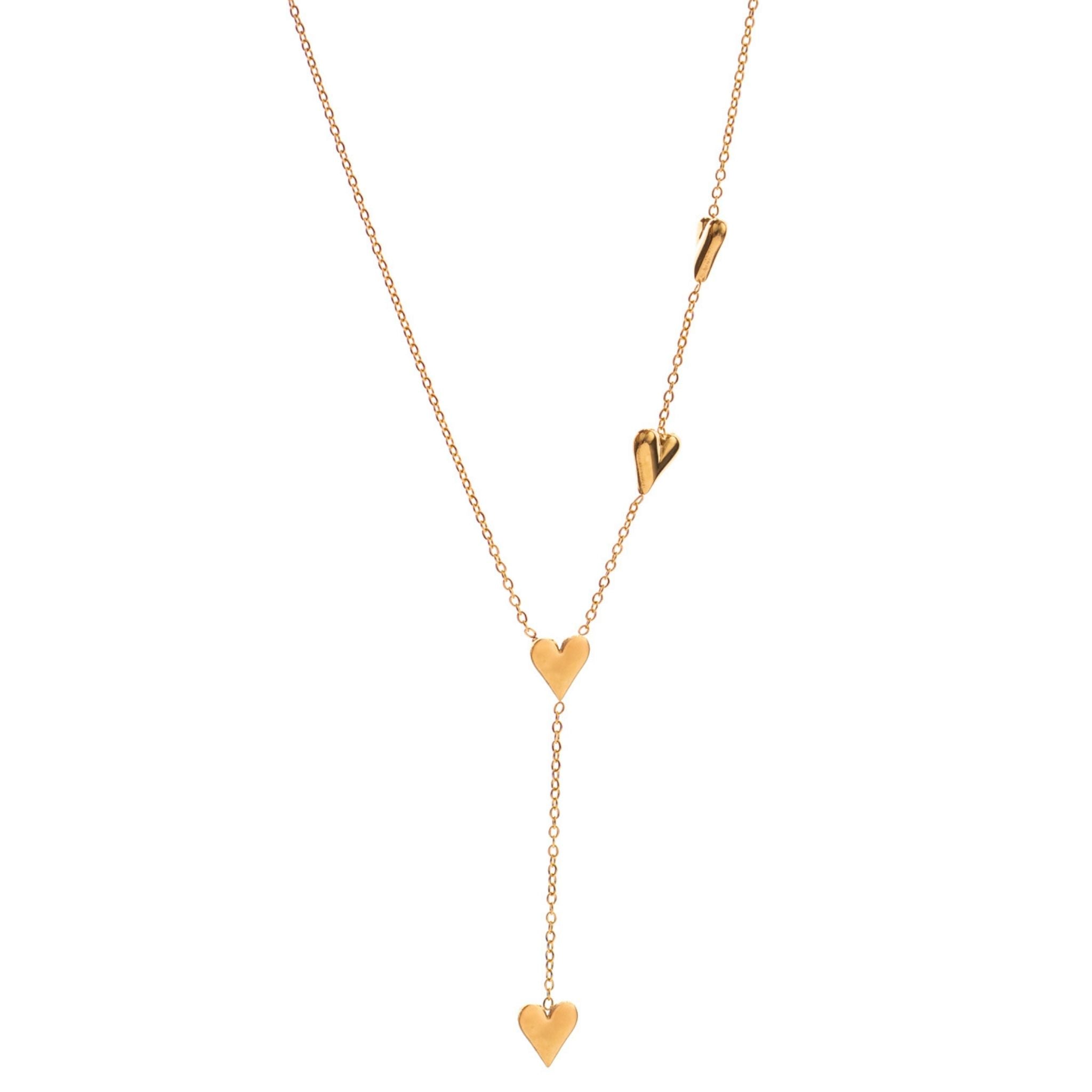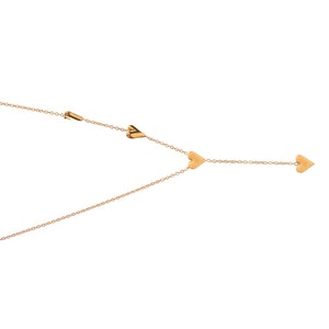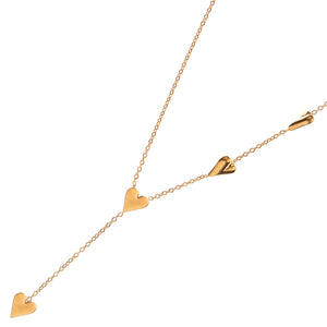 Romantic, refined, and beautifully structured, the Golden Heart Y Necklace by Ebru Jewelry is a study in modern sentimentality. This lariat-style piece features a delicate cascade of golden hearts, anchored by a slender Y-drop silhouette that gracefully elongates the neckline. Crafted from durable stainless steel with a luxe 18k gold-plated finish, it offers the warmth of solid gold with everyday resilience. Whether styled solo to accentuate a plunging neckline or layered with shorter chokers for a textured look, this necklace balances sweetness with sophistication. It is a timeless token of connection—perfect for gifting or keeping as a personal signature.