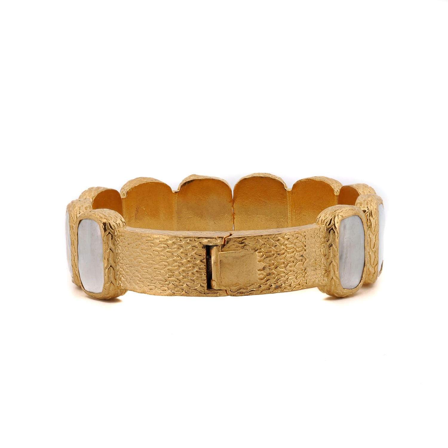 SELL WITH USGolden Aura Elegant Pearl Stone Cuff Bracelet features high-quality brass plated with 24k gold and adorned with lustrous pearls. A blend of traditional elegance and modern sophistication.