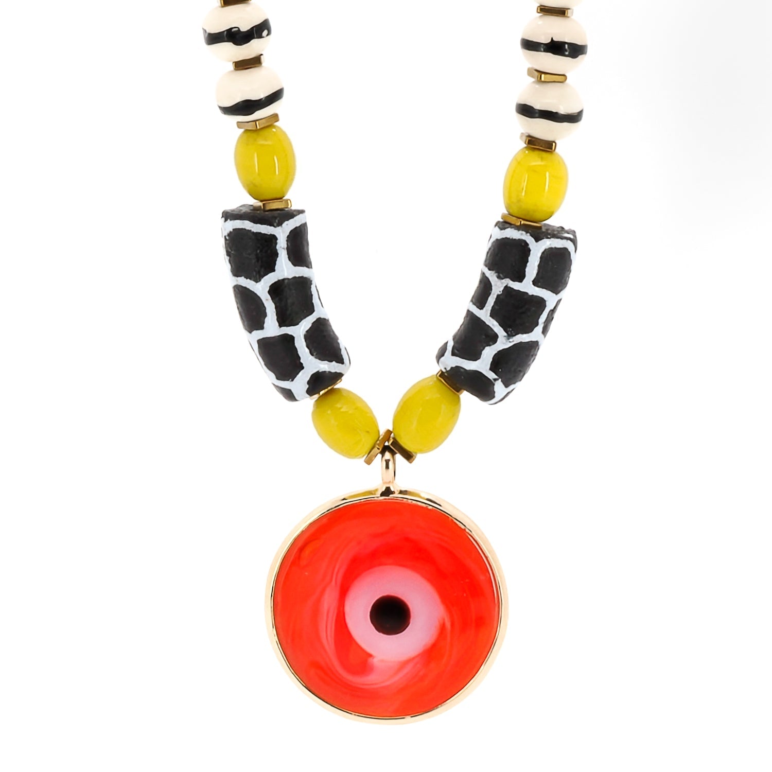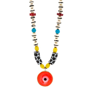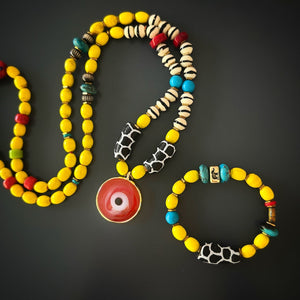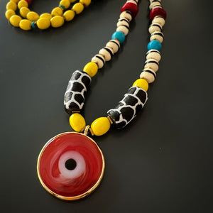 SELL WITH USGood Fortune Red Evil Eye Pendant African Beaded Necklace features Nepal yellow beads, ceramic beads, coral stone, and an 18K gold-plated red evil eye pendant. Symbolizes happiness, protection, and well-being.