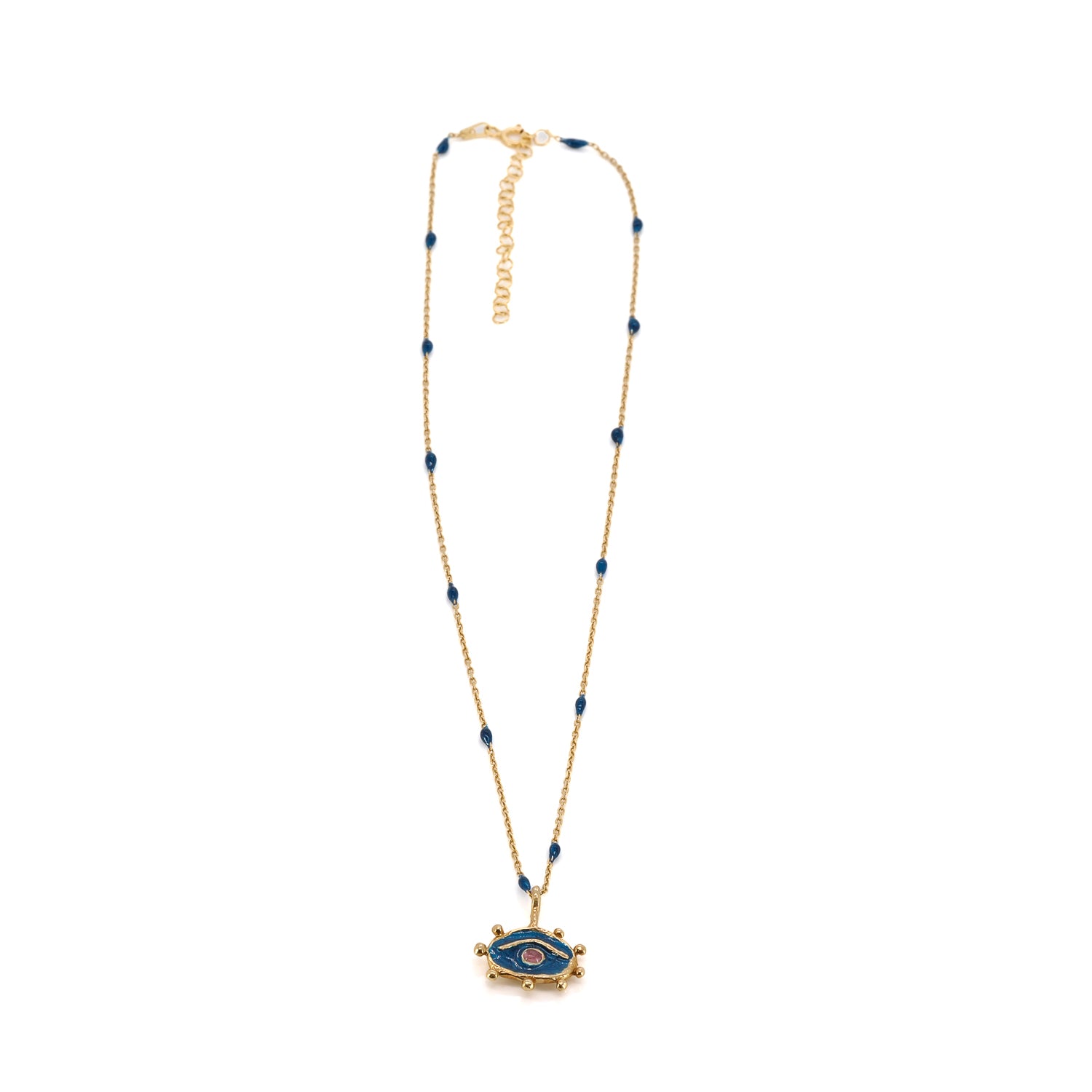 SELL WITH USHittite Sun Blue Enamel Tourmaline Eye Gold Necklace features an 18k gold-plated Hittite Sun pendant on sterling silver, with a pink enamel tourmaline eye. Symbolizes life, prosperity, protection, and intuition.