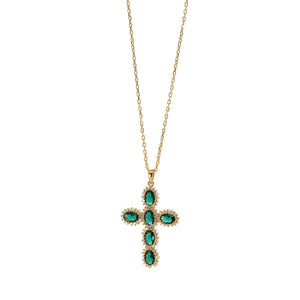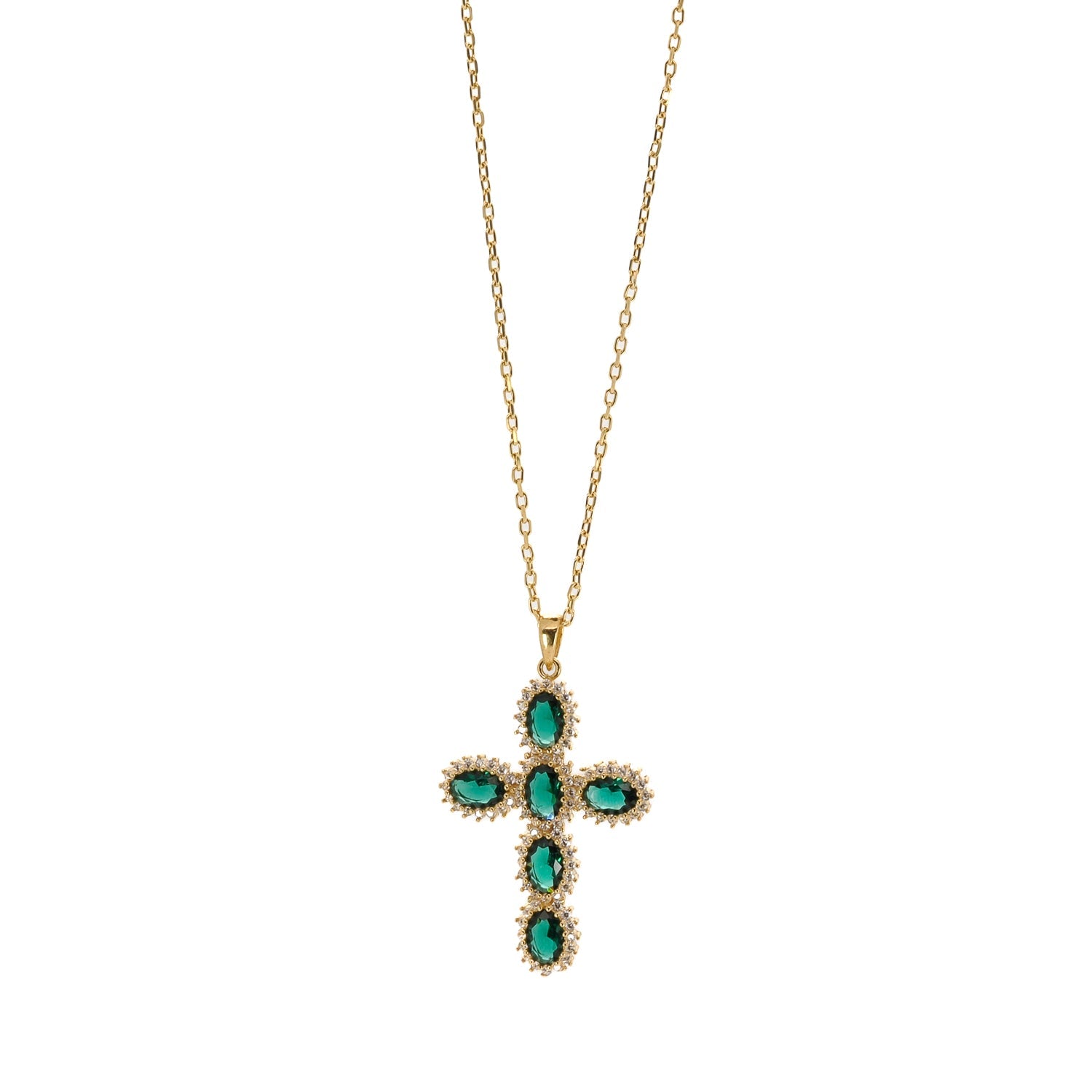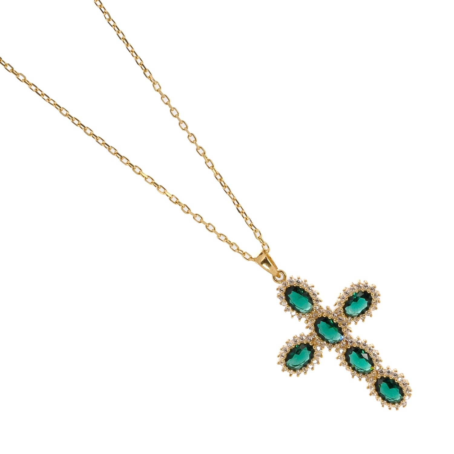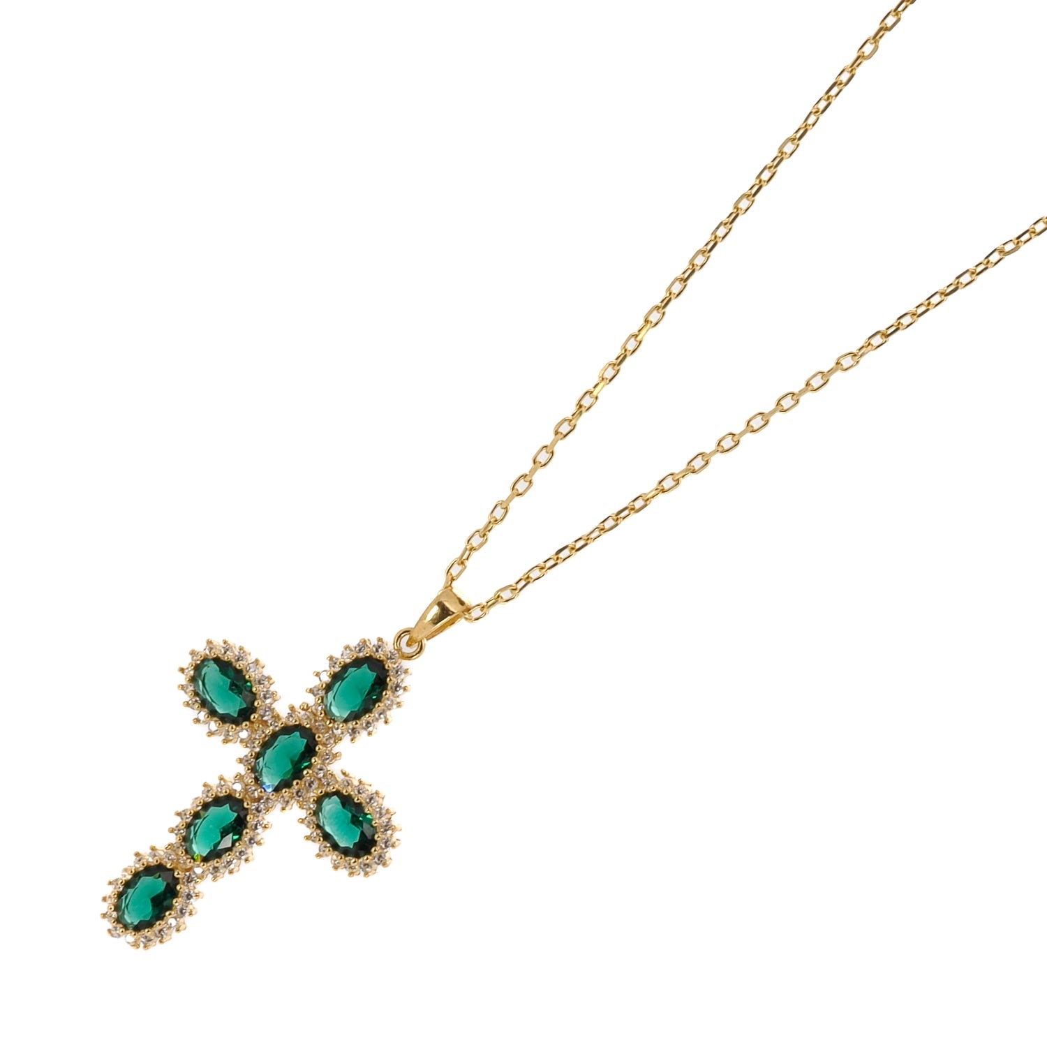 SELL WITH USPassion Diamond & Green Jade Cross Pendant Necklace features an 18k gold-plated sterling silver cross adorned with CZ diamonds and a central jade. Stylish and meaningful accessory.