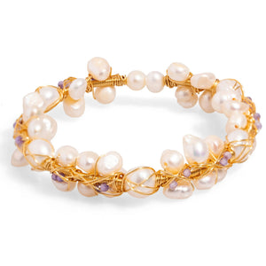Features an open cuff design that can be gently adjusted to fit most wrist sizes. The central pearl cluster creates a substantial, focal point on the wrist.
