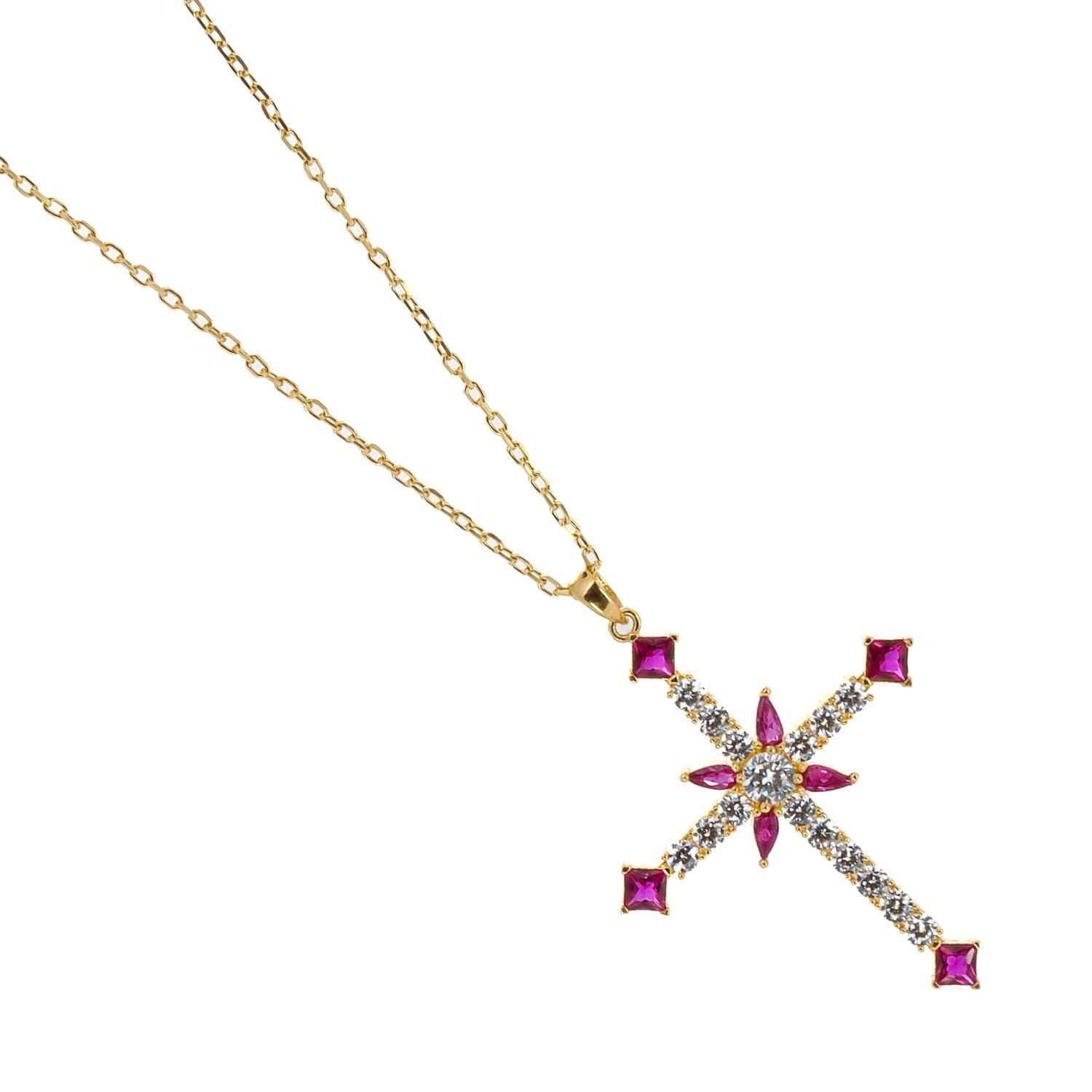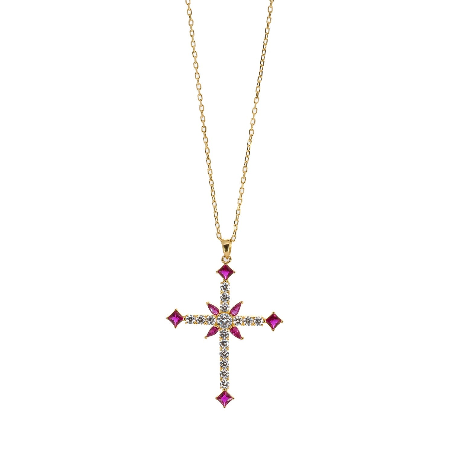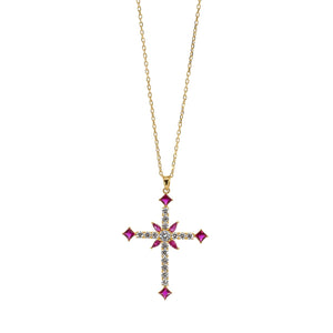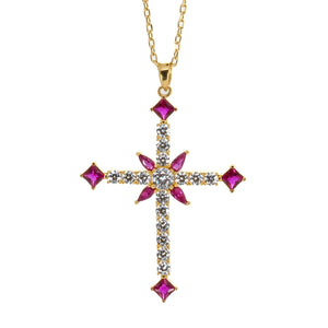 SELL WITH USPassion Diamond & Ruby Stone Cross Pendant Necklace features an 18k gold-plated sterling silver cross adorned with CZ diamonds and a central ruby. Stylish and meaningful accessory.