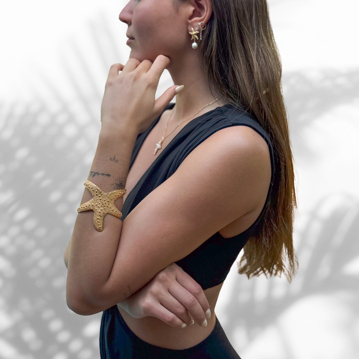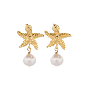 SELL WITH USMajestic Gold Starfish & Pearl Earrings feature 24k gold-plated starfish motifs and dangling lustrous pearls. Perfect for casual beach days or formal seaside evenings.