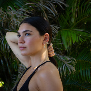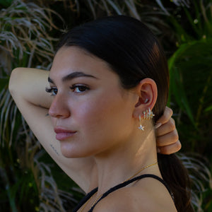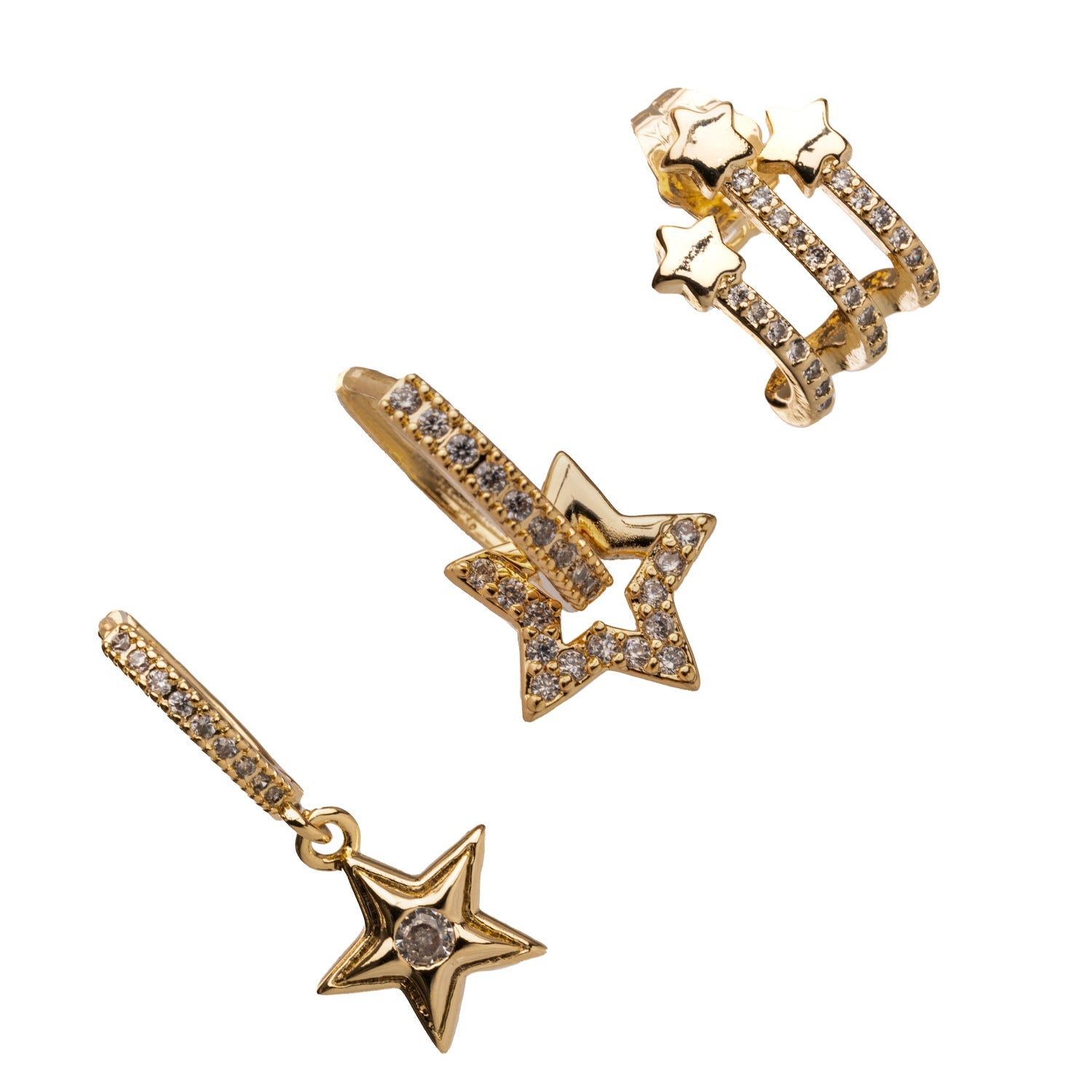 Includes a curated set of three single earrings: two distinct hoops and one star stud. Designed for multiple piercings to create a mismatched, layered "ear party" look.