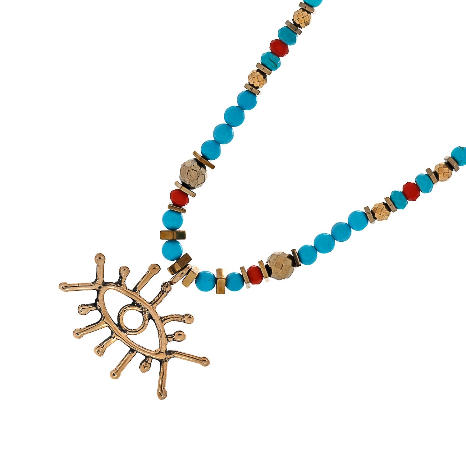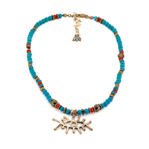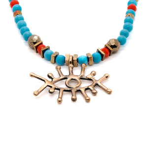 Composition: Turquoise beads, Gold Hematite stone beads, Red Crystal beads, Bronze Eye Pendant