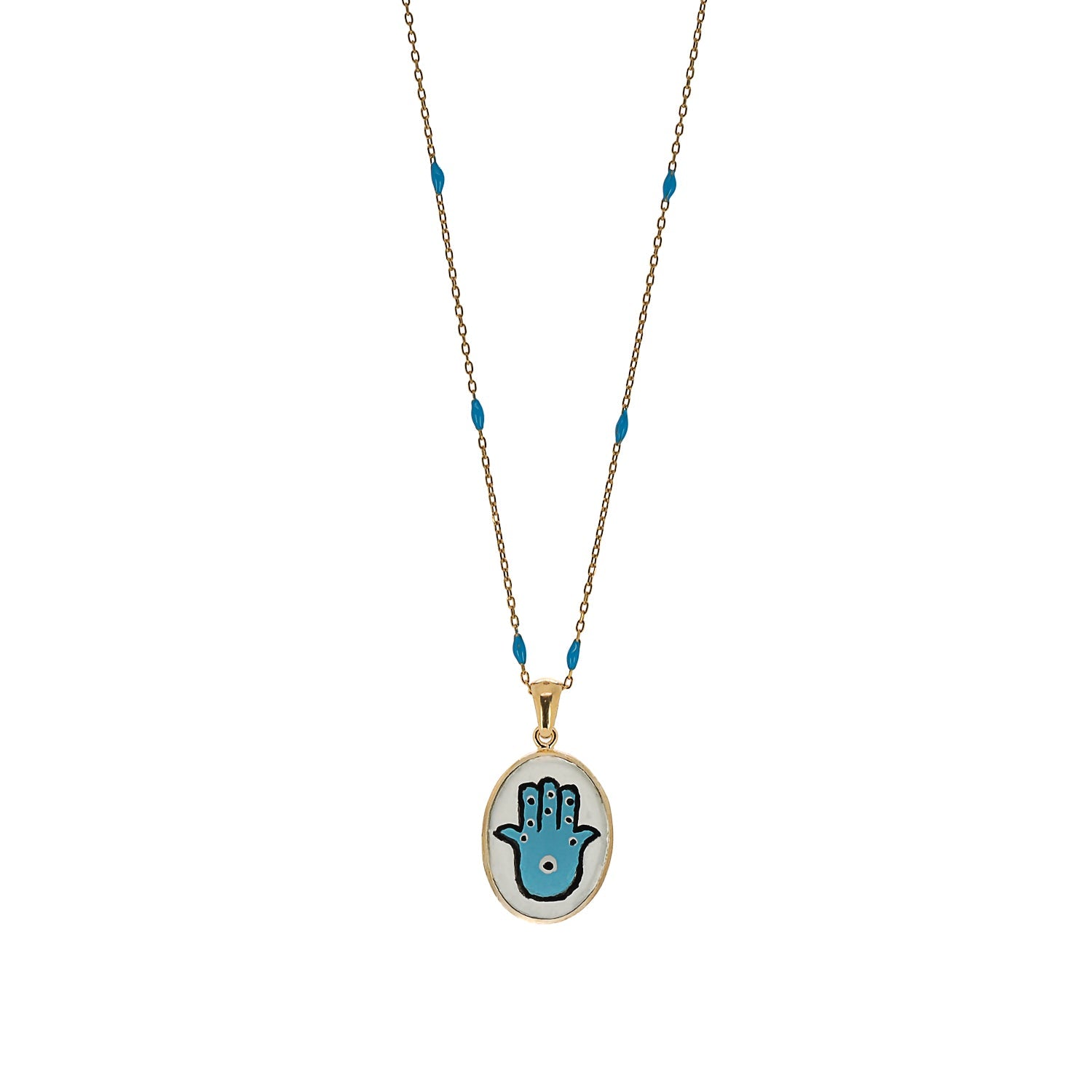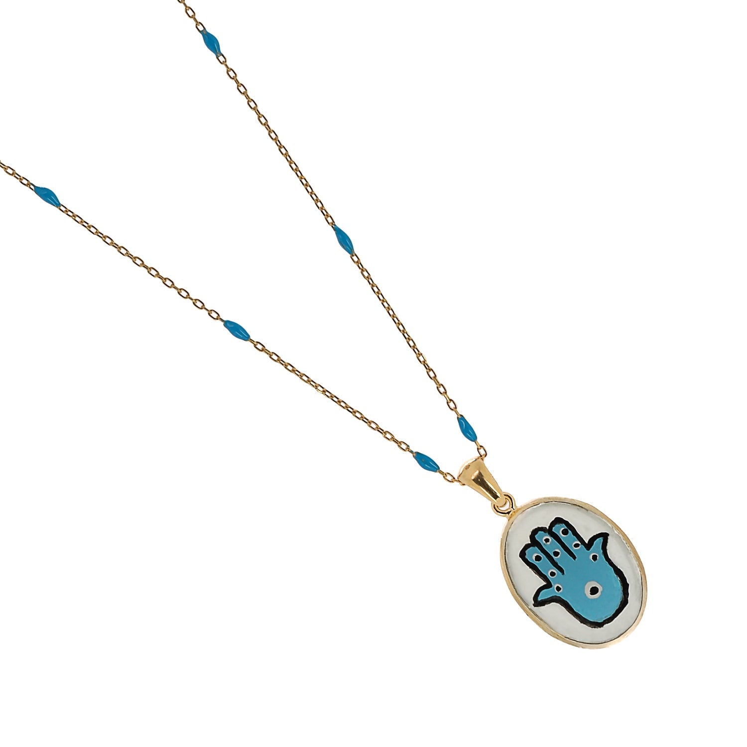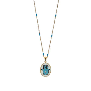 SELL WITH USThe Hamsa Good Fortune Turquoise & Gold Chain Necklace features handcrafted sterling silver with 18K gold plating and turquoise enamel. Symbolizes protection, strength, and good fortune.