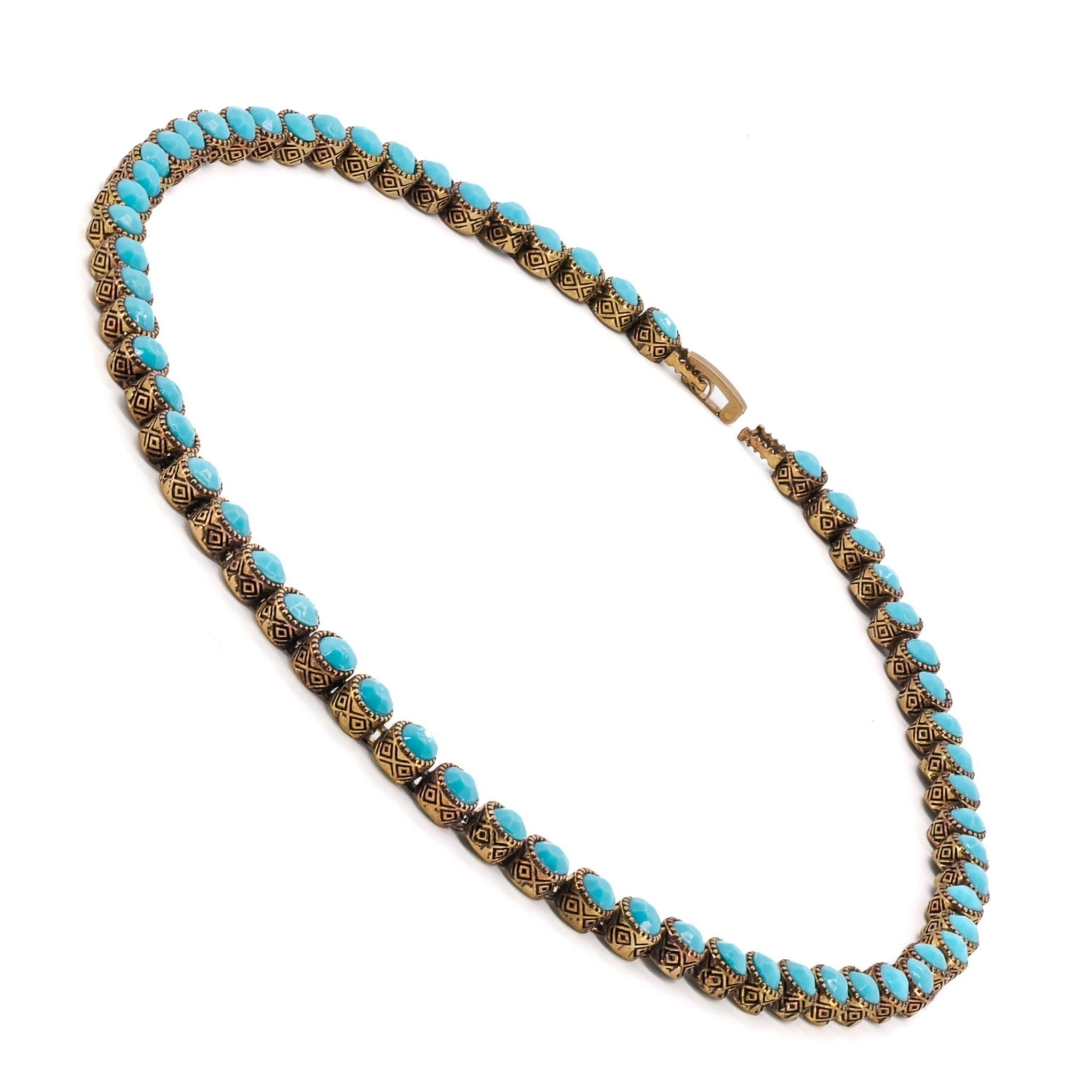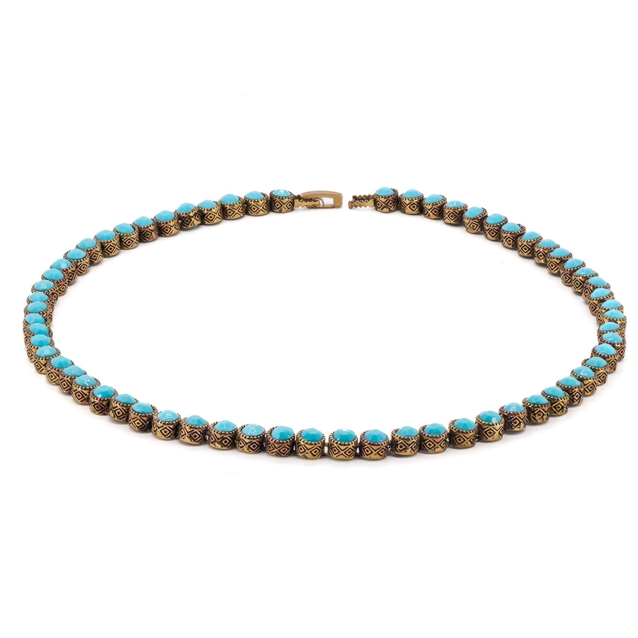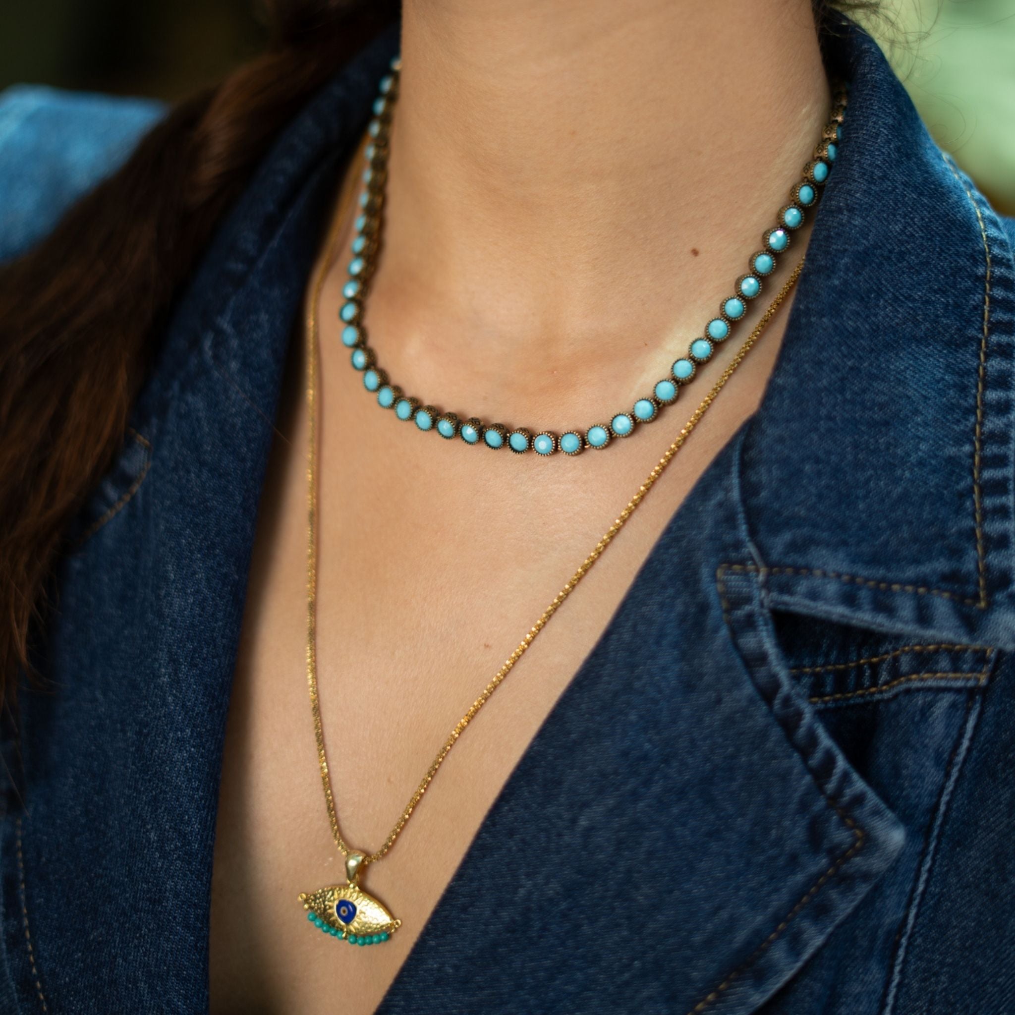 Redefining a classic silhouette with earthy soul, the Turquoise Tennis Mystic Necklace by Ebru Jewelry trades traditional sparkle for vibrant, saturated color. Handcrafted in the USA, this piece features a continuous line of reconstituted turquoise stones set in high-quality bronze—a warm, ancient metal that perfectly complements the cool azure tones. It’s a tennis necklace for the modern bohemian: polished enough for evening wear but grounded enough for everyday rituals. Beyond its striking aesthetic, turquoise is worn as a talisman of purification and balance, making this necklace a wearable source of inner calm. Style it solo for a pop of color, or layer it with gold chains to amplify its golden-bronze undertones.