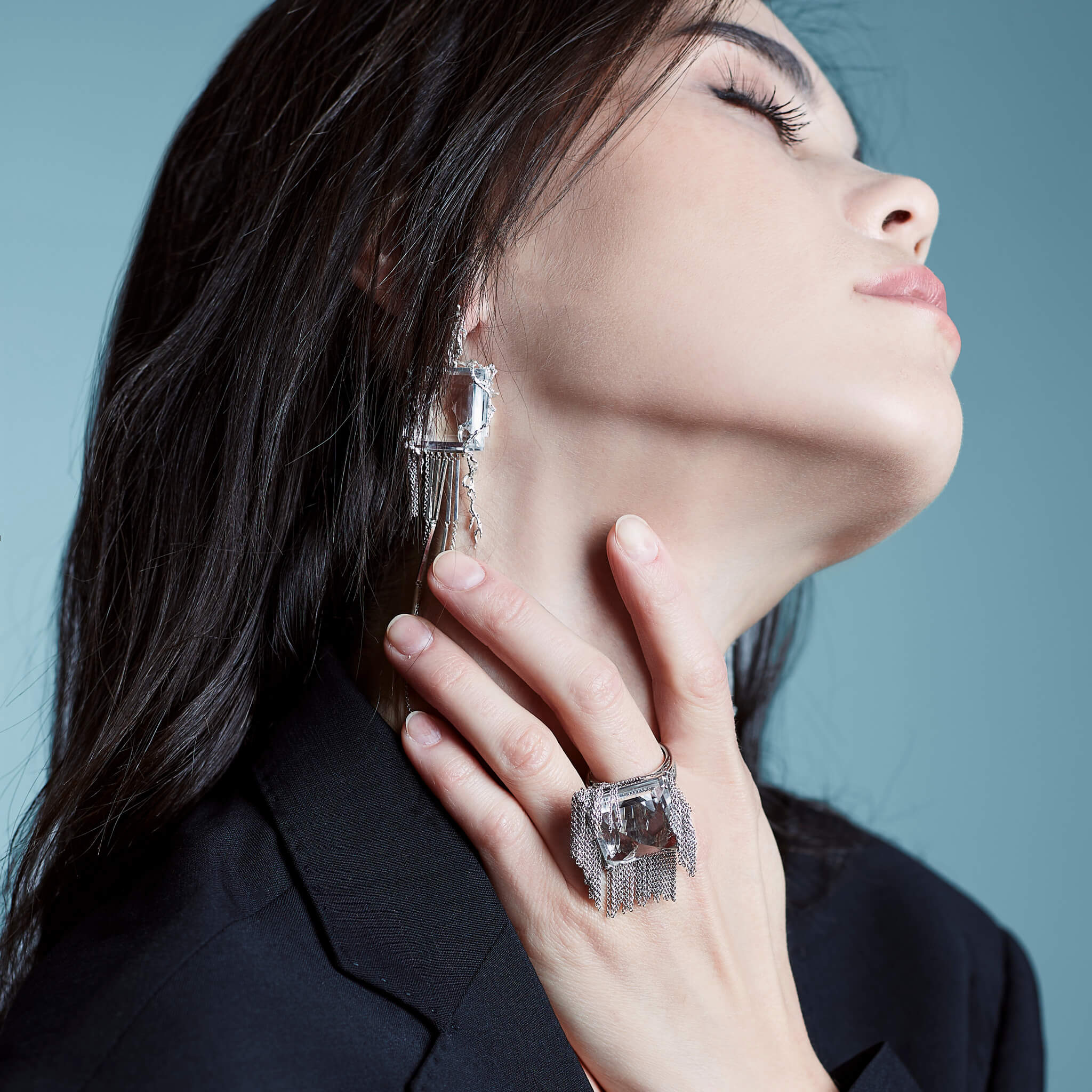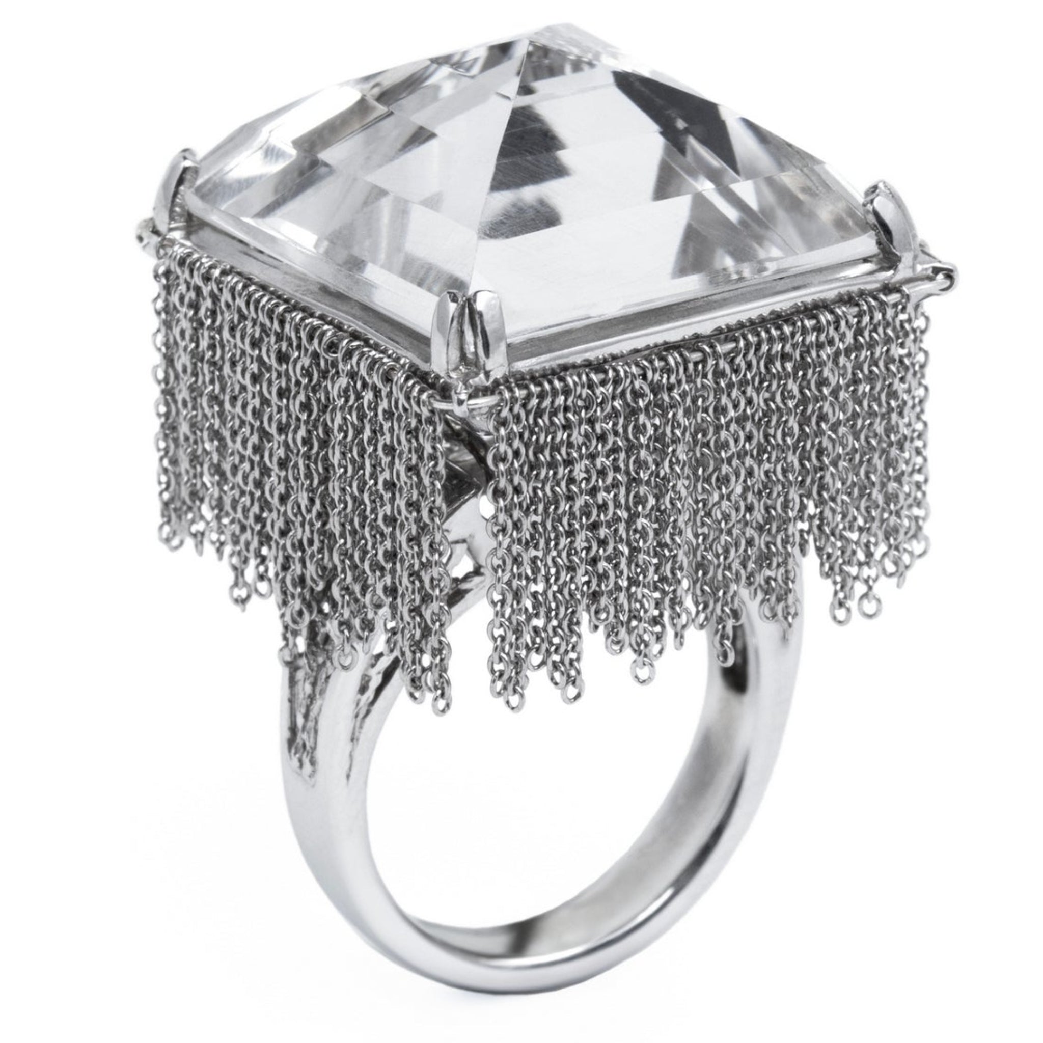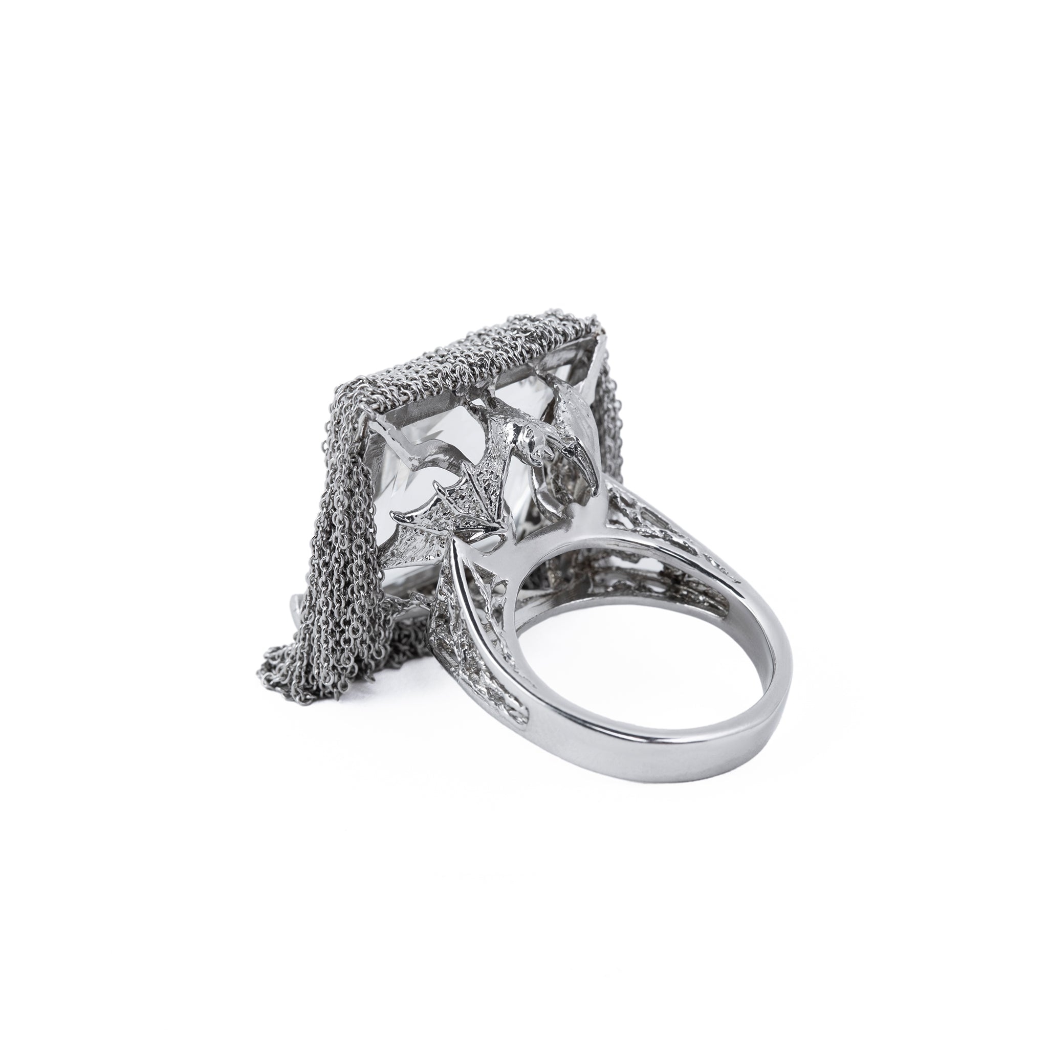 A ring built for the runway and worn like a secret. The Pyramid Ring centers a monumental clear quartz cut to a true pyramid — its facets scattering rainbows with every movement, its silver chain curtain catching the light like a chandelier on the hand. Turn it over and you'll find what hides beneath: a tiny bat, sheltered in an intricate silver structure, invisible to anyone who doesn't know to look. Fully made in 925 sterling silver with rhodium plating.
