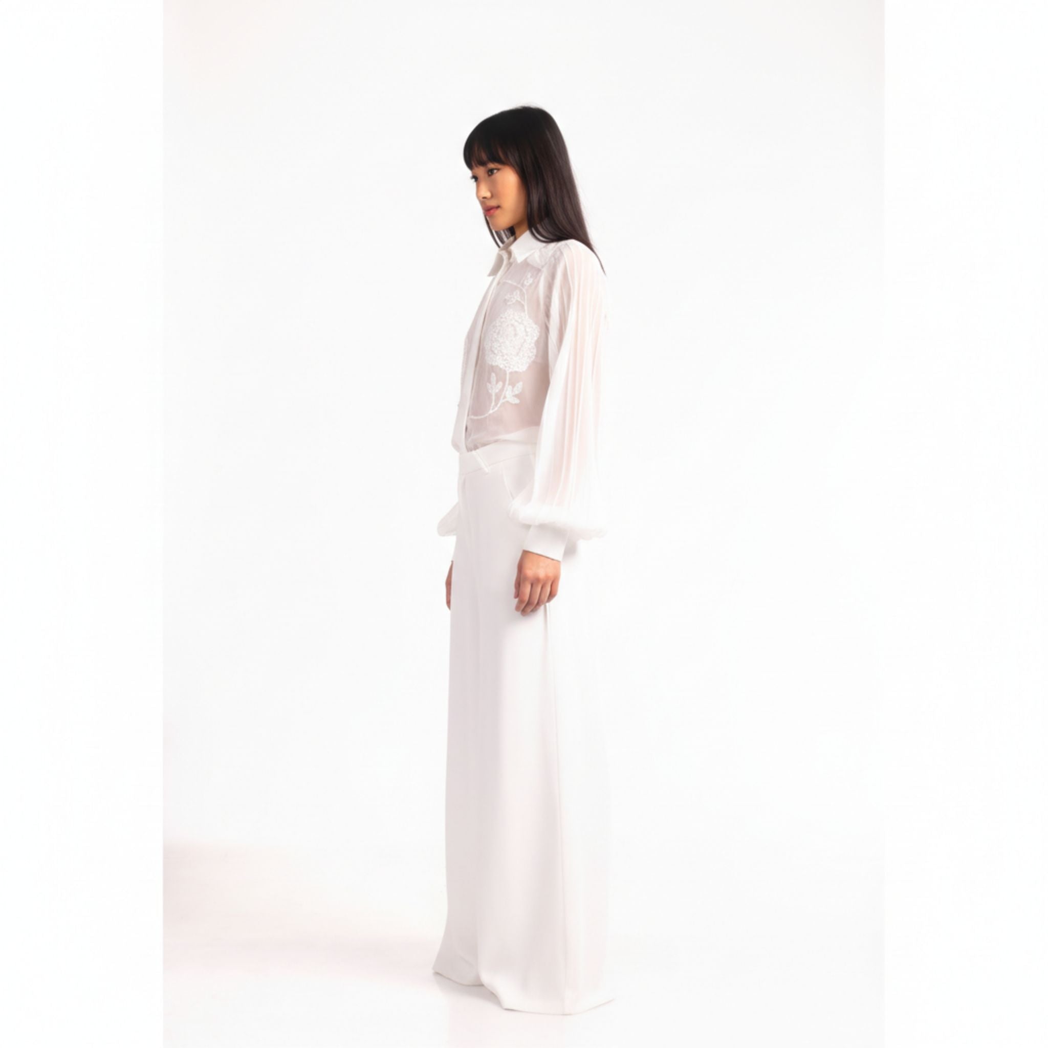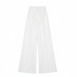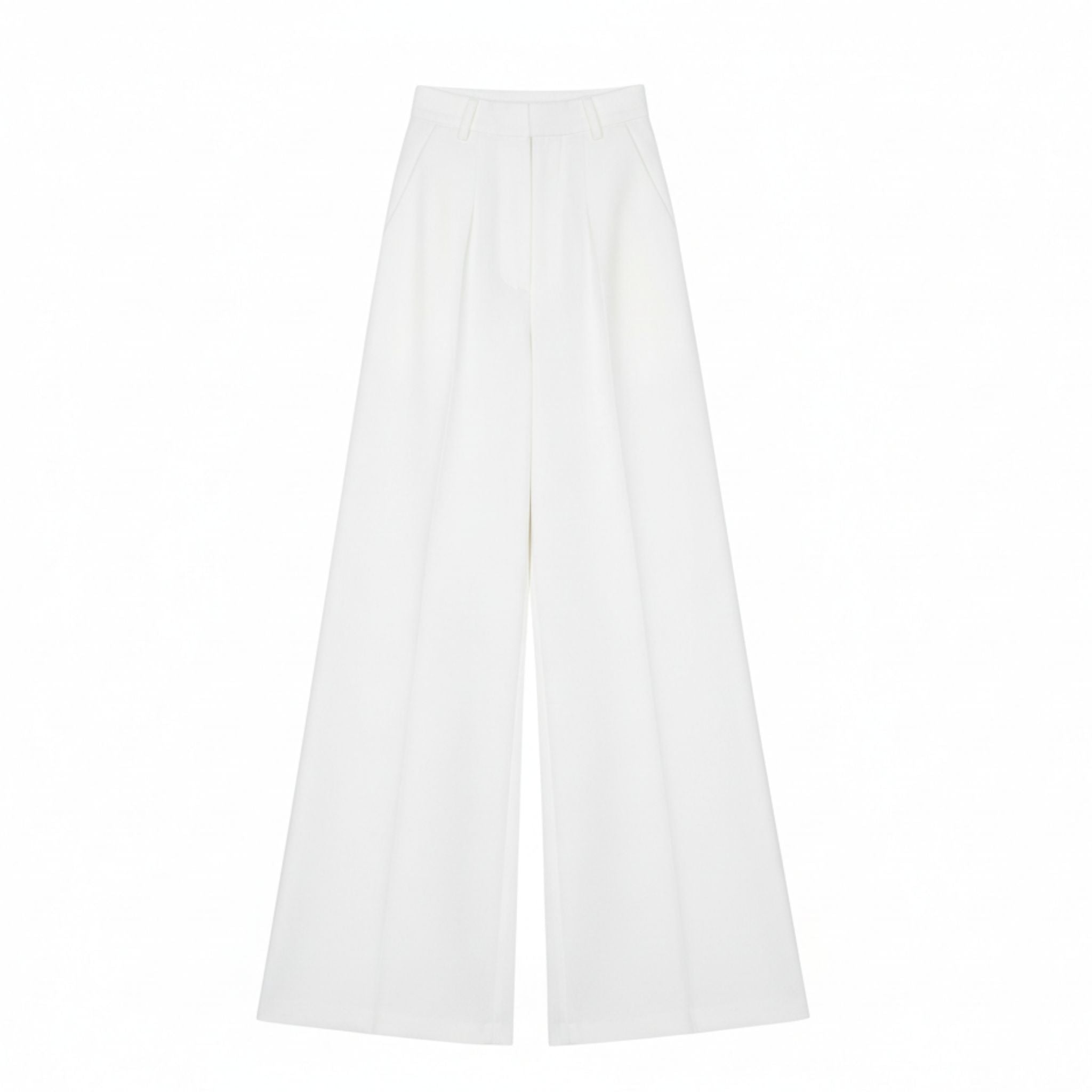 Tailored for modern sophistication, these high-waist flared trousers feature a sleek front zipper, asymmetric belt loops at the front and back, and clean side straight pockets. Designed to elongate the silhouette with a structured yet fluid flare, they offer a refined edge to contemporary dressing.