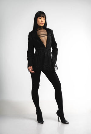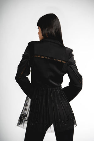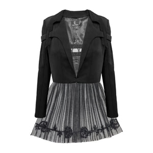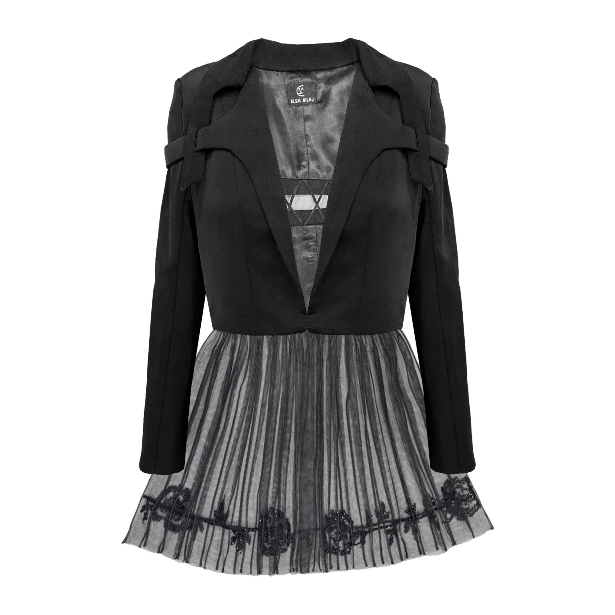 This elegant peplum-style jacket showcases detailed cross-stitch embroidery along the border, crafted on cancan fabric for subtle volume and structure. Featuring long sleeves and a meticulously constructed lapel that extends to the back, it blends classic tailoring with artisanal craftsmanship—perfect for refined, statement layering.