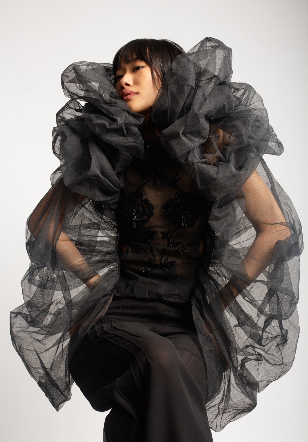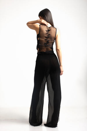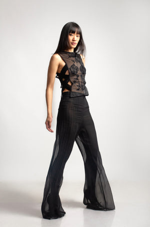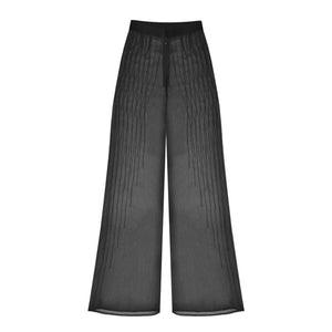Elevate your silhouette with these ethereal sheer flared trousers, featuring elegant pin-tuck detailing along the sides for added structure and movement. Lightweight and flowing, they blend modern femininity with tailored precision—perfect for layering or standout styling.