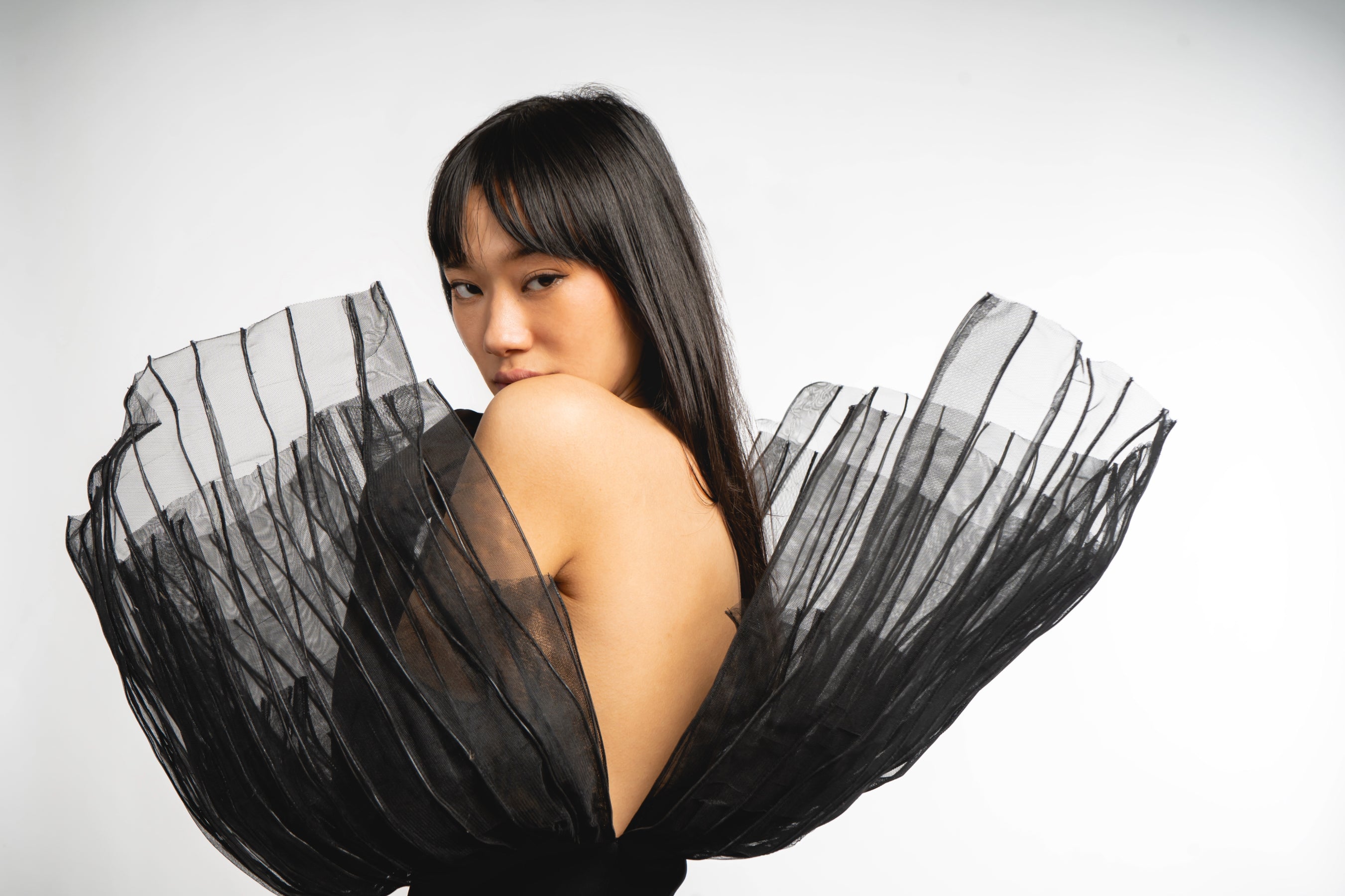 This sculptural corset blends delicate craftsmanship with bold structure. Crafted from sheer can-can fabric, it features intricate pintucks and moldable wires to create a sharply defined silhouette. The front is layered with multiple panels of sheer fabric for added volume and dimension, while the adjustable tie-up back ensures a perfect fit. A striking piece for elevated, avant-garde styling.