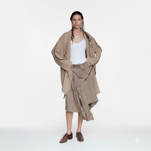 SELL WITH USCrafted in a warm neutral knit, this oversized cardigan by HANAN merges artisanal embroidery with relaxed tailoring. Adorned with hand-stitched motifs and whipstitch details along the edges, it carries both cultural storytelling and modern ease. The draped silhouette, wide sleeves, and open front make it a versatile layering piece, whether styled over tailored separates or worn casually with denim.