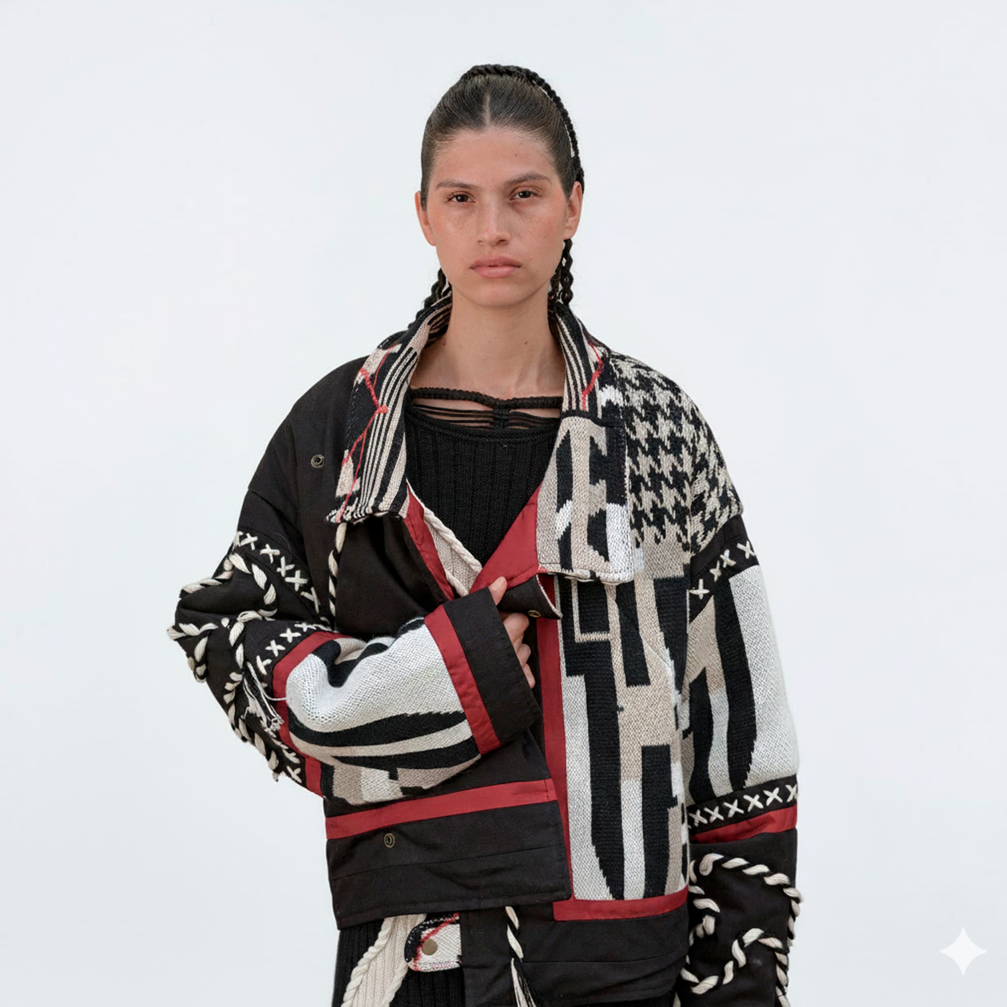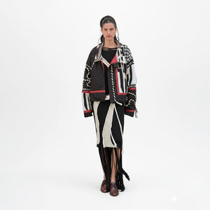 SELL WITH USBold geometry meets streetwise tailoring in this oversized jacket. Designed in a graphic black-and-white patchwork with pops of deep red trim, it reinterprets Andean cosmovisión–inspired motifs into a striking modern layer. Insulated with Alpafill®, a sustainable alpaca-based filling, it offers lightweight warmth and comfort. The relaxed silhouette, dropped shoulders, and zip-front closure make it versatile for everyday wear, while its statement pattern transforms it into a collectible piece of independent design. Perfect styled over monochrome dresses or casual separates, this limited-edition jacket reflects Estrafalario’s commitment to artistic craftsmanship and contemporary edge.
