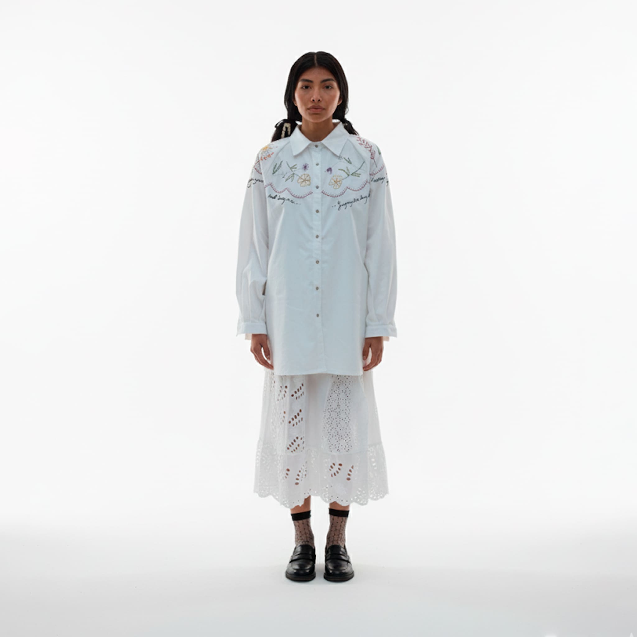SELL WITH USHandcrafted with an artisanal touch, this oversized white cotton shirt is distinguished by delicate hand-embroidered floral motifs across the yoke and back. The relaxed silhouette with voluminous sleeves offers effortless movement, while the intricate embroidery elevates it beyond an everyday shirt into a collectible piece of wearable art. Designed for layering over dresses or pairing with tailored trousers and timeless craftsmanship rooted in Latin American heritage