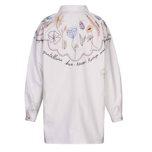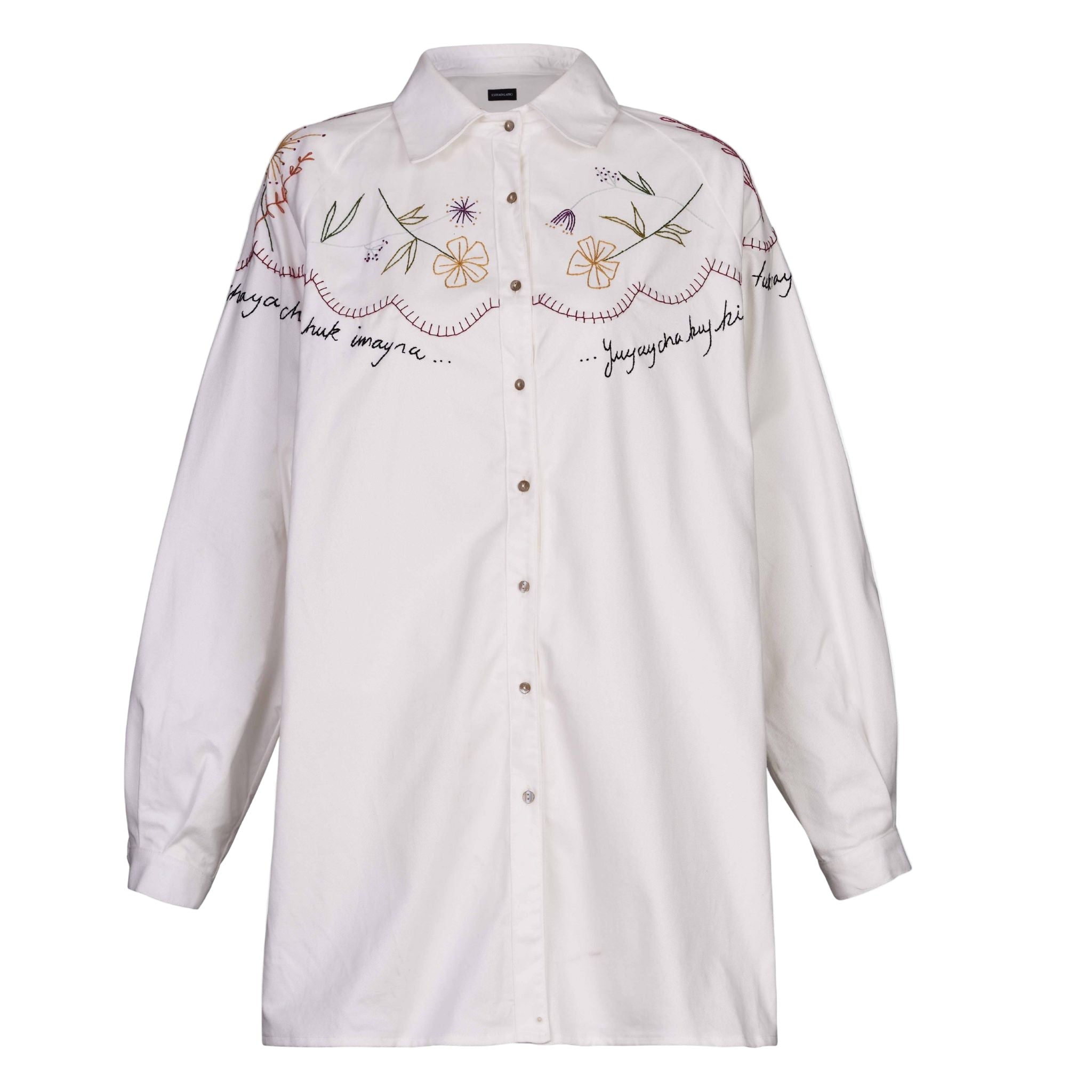 Handcrafted with an artisanal touch, this oversized white cotton shirt is distinguished by delicate hand-embroidered floral motifs across the yoke and back. The relaxed silhouette with voluminous sleeves offers effortless movement, while the intricate embroidery elevates it beyond an everyday shirt into a collectible piece of wearable art. Designed for layering over dresses or pairing with tailored trousers and timeless craftsmanship rooted in Latin American heritage