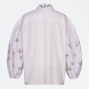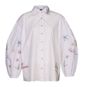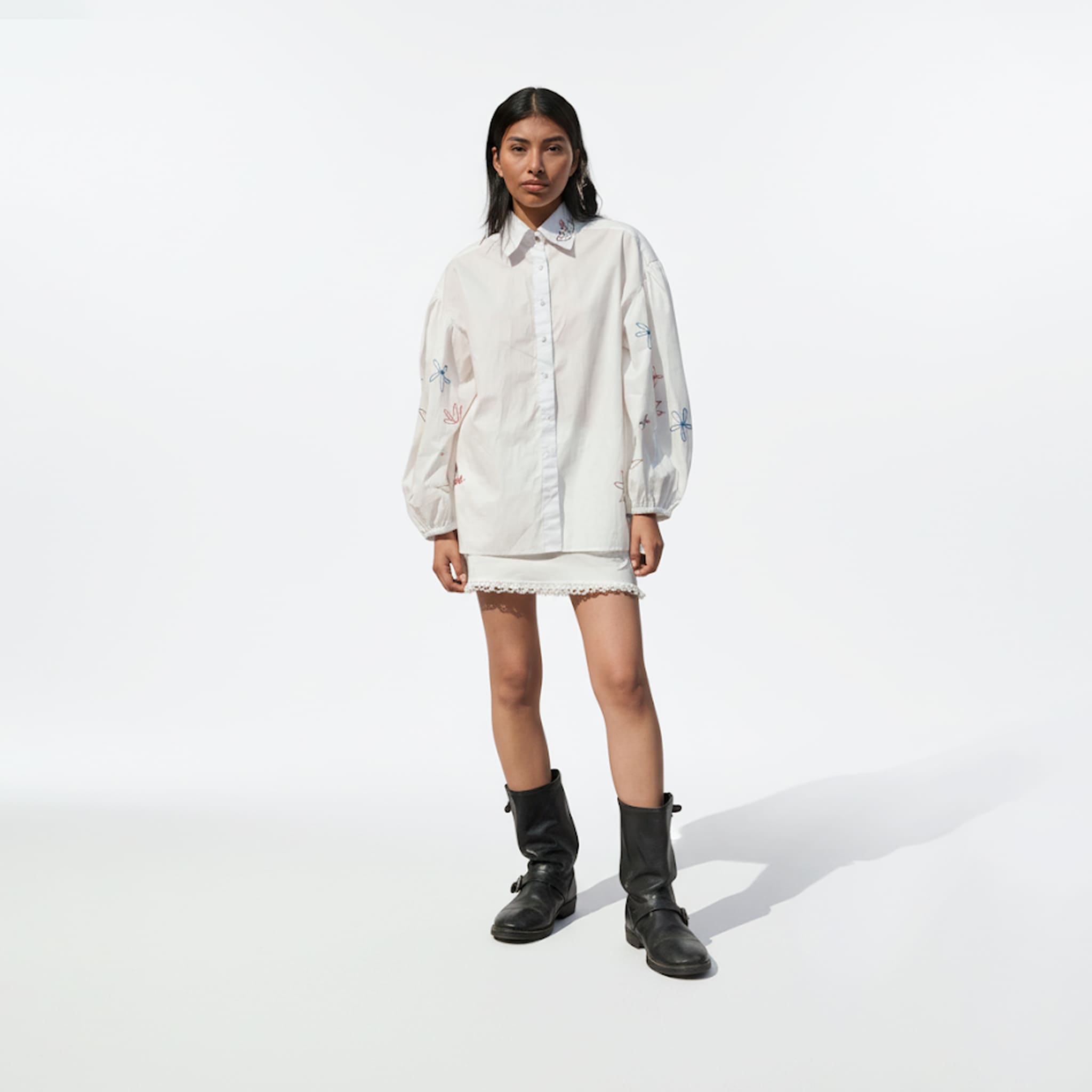 A fresh take on the timeless white shirt, this oversized cotton blouse features subtle hand-embroidered floral details along the sleeves and collar. With voluminous balloon sleeves and a relaxed silhouette, it balances structure with softness, making it versatile enough to style as a dress with bare legs or layered over shorts and trousers. Lightweight and breathable, it’s a seasonless staple reimagined with artisanal detail.