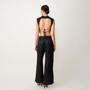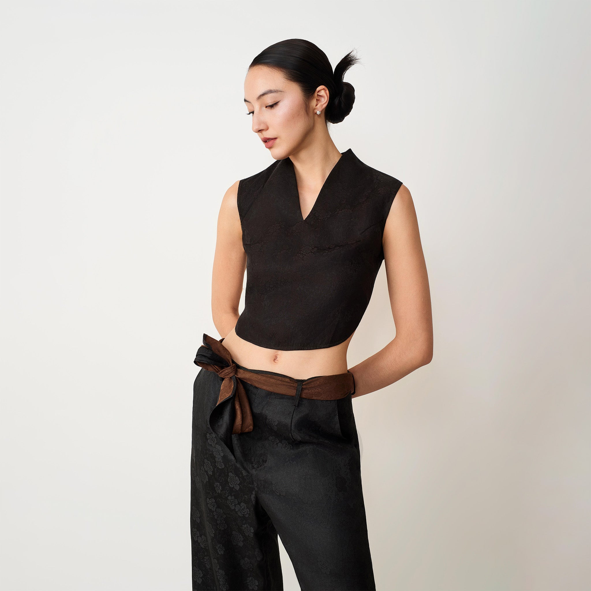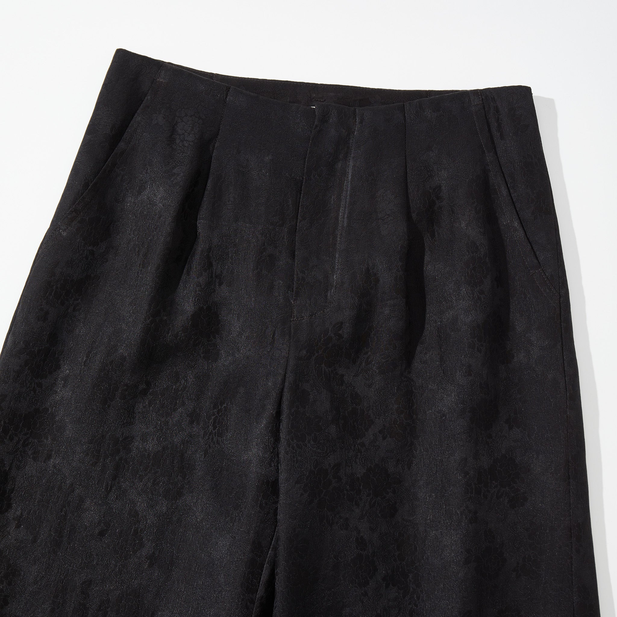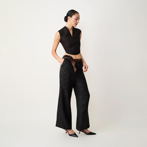 These wide-leg trousers unite heritage textile craftsmanship with modern tailoring. Designed with a fluid silhouette that elongates the figure, they are crafted from 100% natural-dyed Gambiered Canton Gauze, reflecting traditional artistry with a contemporary sensibility. A detachable belt in the same textile allows versatile styling, featuring subtle floral jacquard on one side and a rich contrasting tone on the other. Concealed side pockets and subtle slits at the hem complete the design, balancing refined aesthetics with everyday functionality.