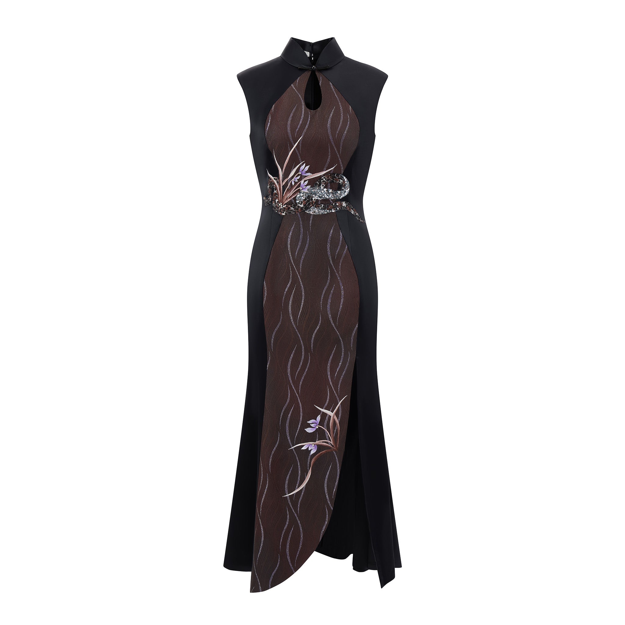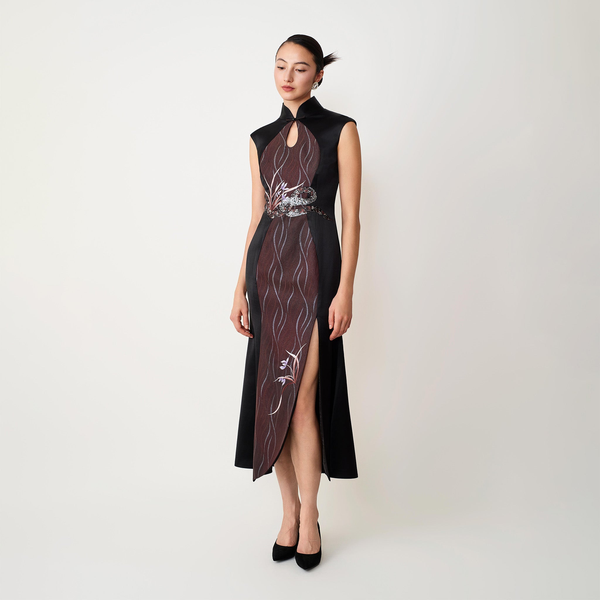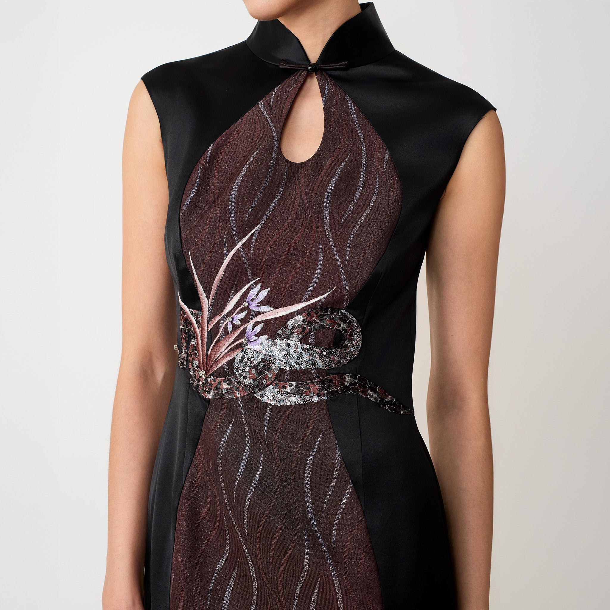 The Snake & Orchid Embroidered Qipao in brown embodies poetic femininity and refined craftsmanship. Tailored from Japanese silk, its iridescent wave jacquard blends brown and purple in a subtle ombré. An embroidered orchid and snake at the waist symbolize grace and quiet strength, while a mandarin collar, teardrop neckline, and front slit with fishtail hem complete the design with timeless elegance and a modern edge.