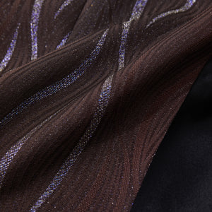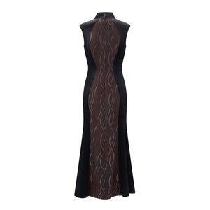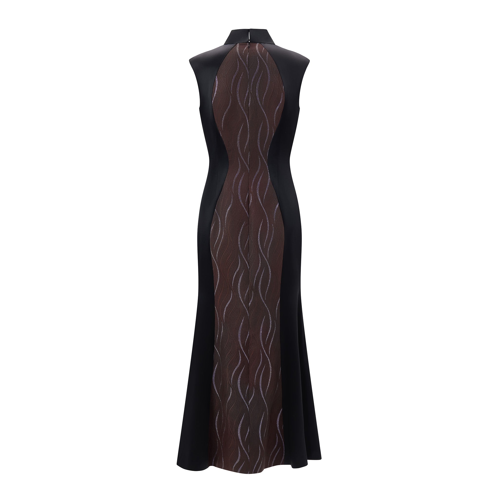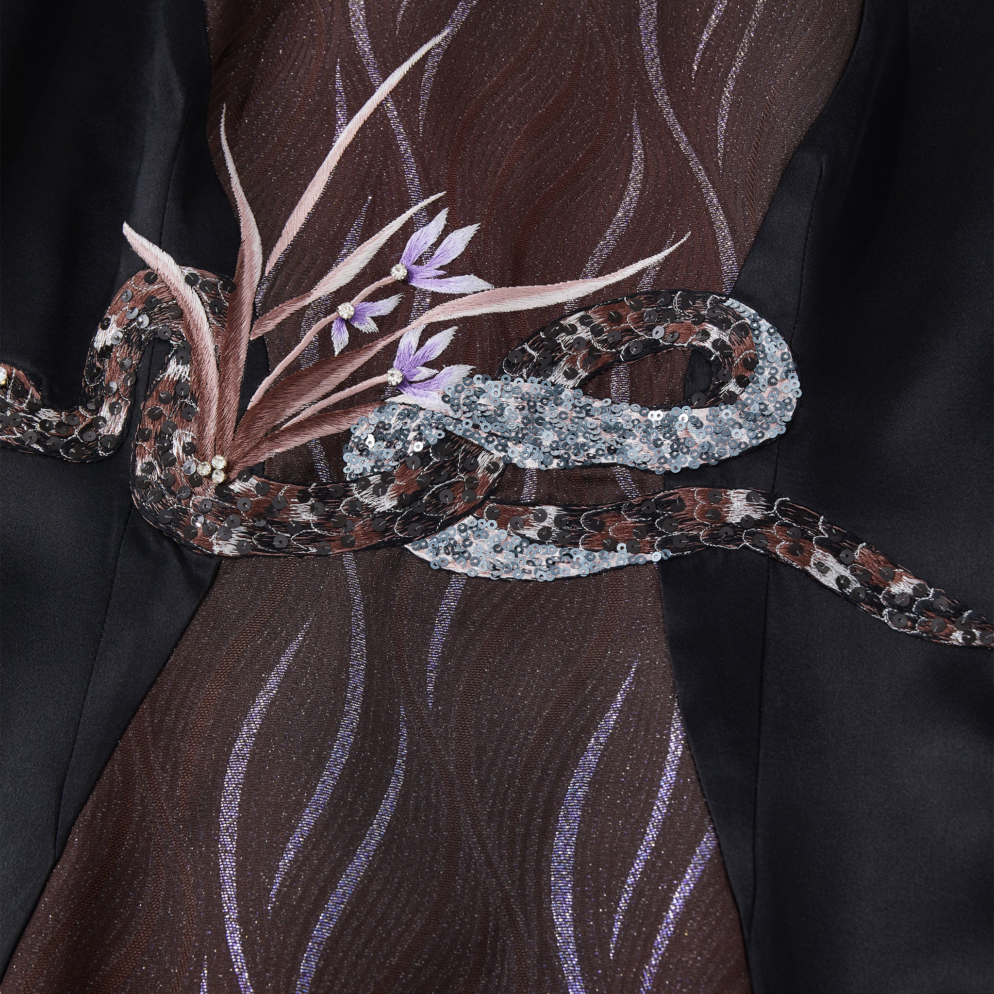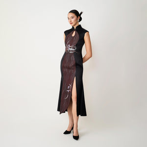 The Snake & Orchid Embroidered Qipao in brown embodies poetic femininity and refined craftsmanship. Tailored from Japanese silk, its iridescent wave jacquard blends brown and purple in a subtle ombré. An embroidered orchid and snake at the waist symbolize grace and quiet strength, while a mandarin collar, teardrop neckline, and front slit with fishtail hem complete the design with timeless elegance and a modern edge.