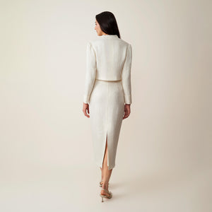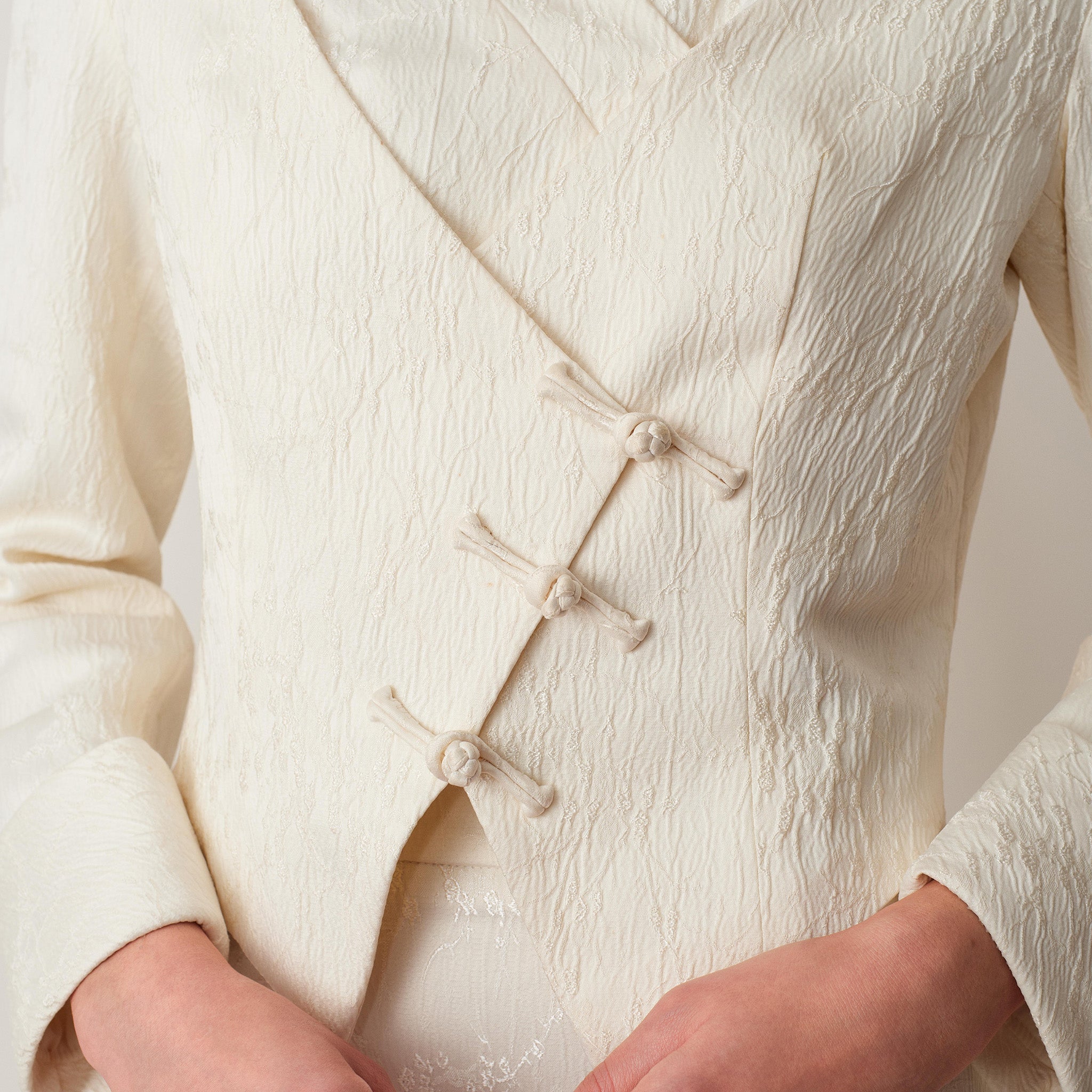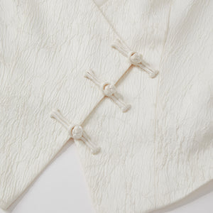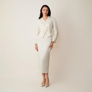 The Asymmetrical Cropped Blazer reimagines classic tailoring with subtle East-inspired elegance. Featuring an asymmetrical front with traditional knot button closures, it blends cultural detail with modern design. Clean lines and thoughtful construction make it suitable for both formal occasions and elevated everyday wear.