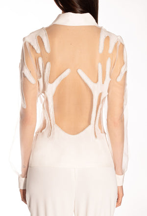Its sheer texture and artisanal detailing create a unique interplay of movement and transparency, offering a bold yet elegant statement piece.
