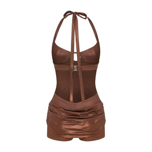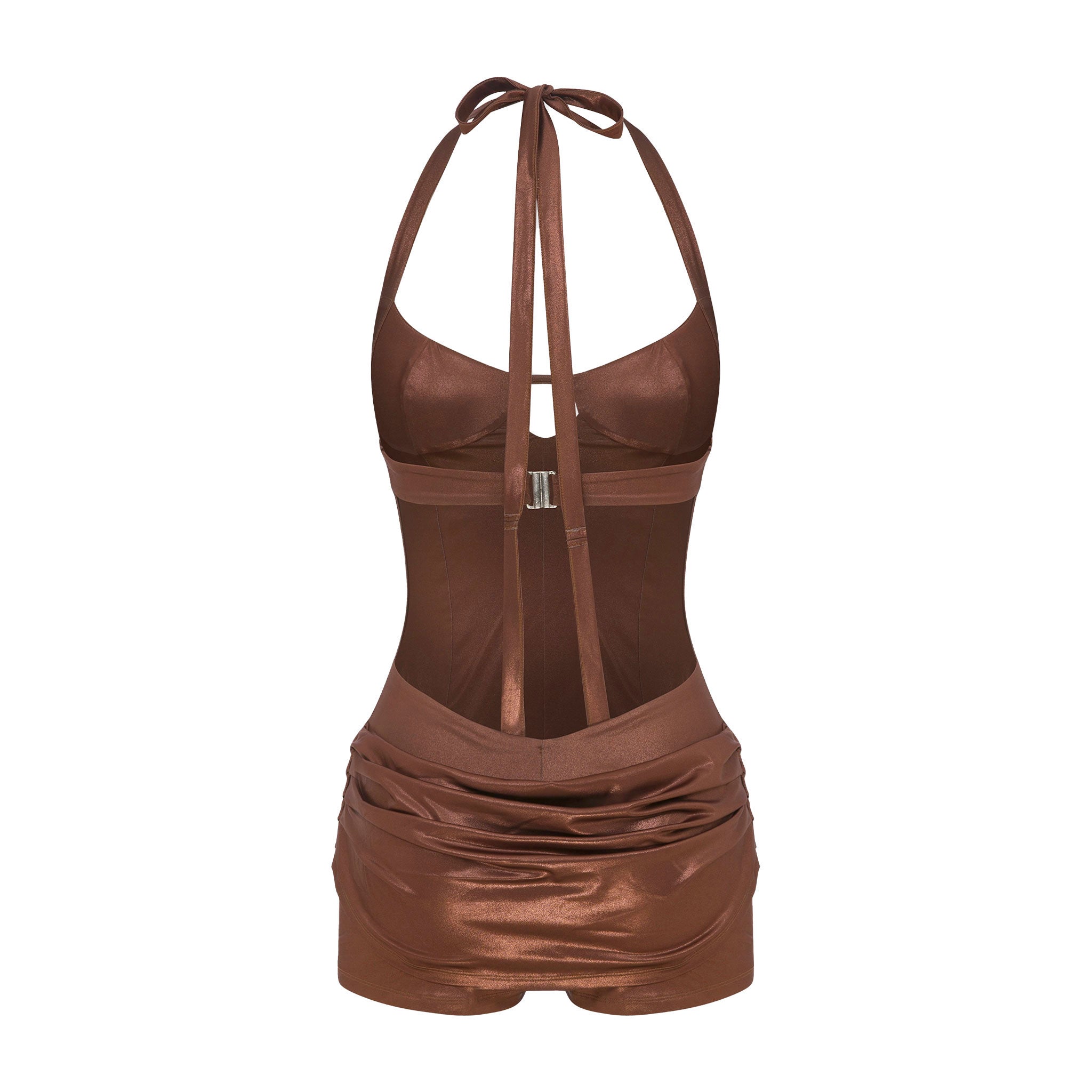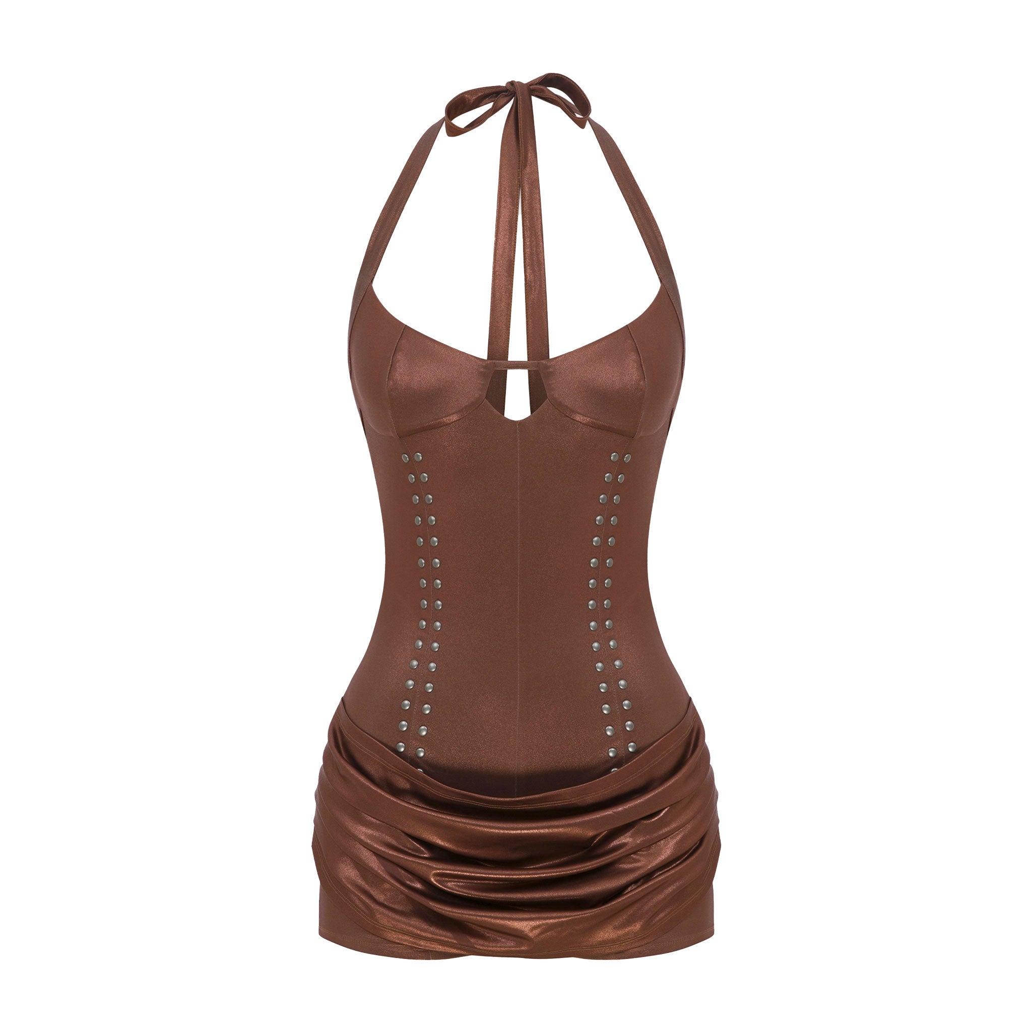 Sleeveless jumpsuit with an open back, adjustable ties at the neck, decorative rivets, and a decorative skirt detail at the front and back.