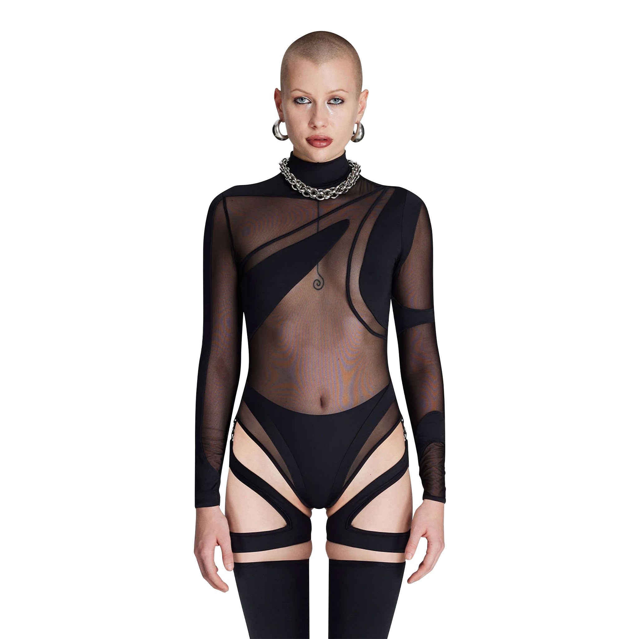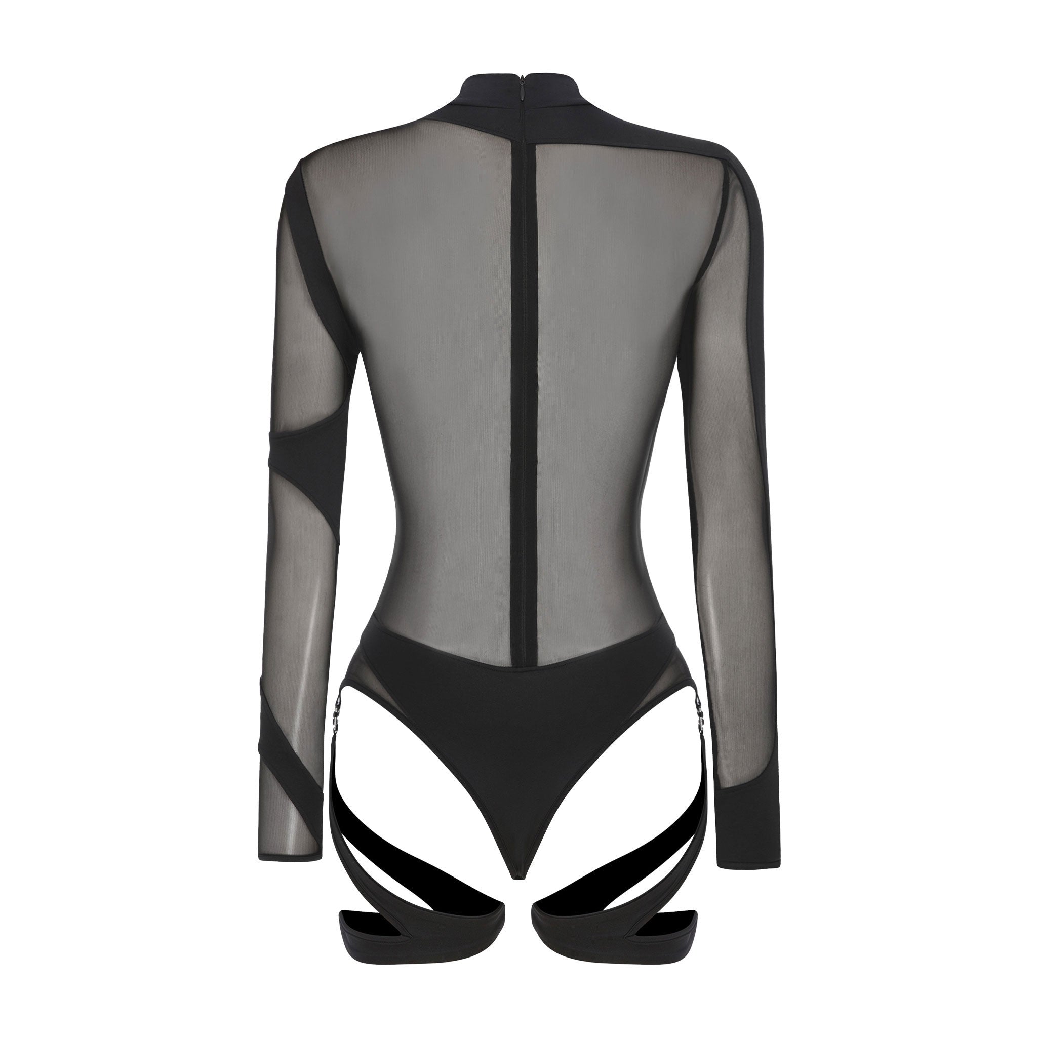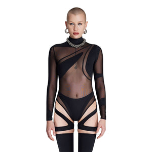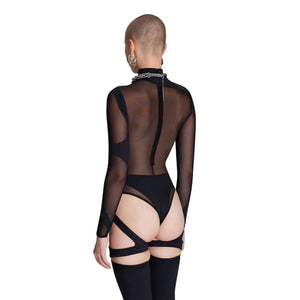 Long-sleeved mesh bodysuit with front and back geometrical fabric inserts, and removable garter details
