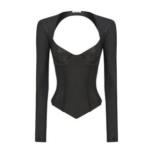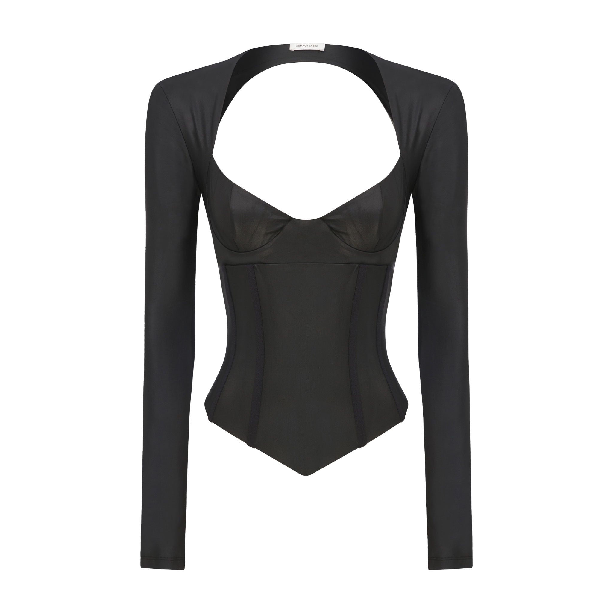 Long-sleeved corset made of fabric with a leather effect. It features boning in the bust area and a lace-up back, allowing for adjustable width.