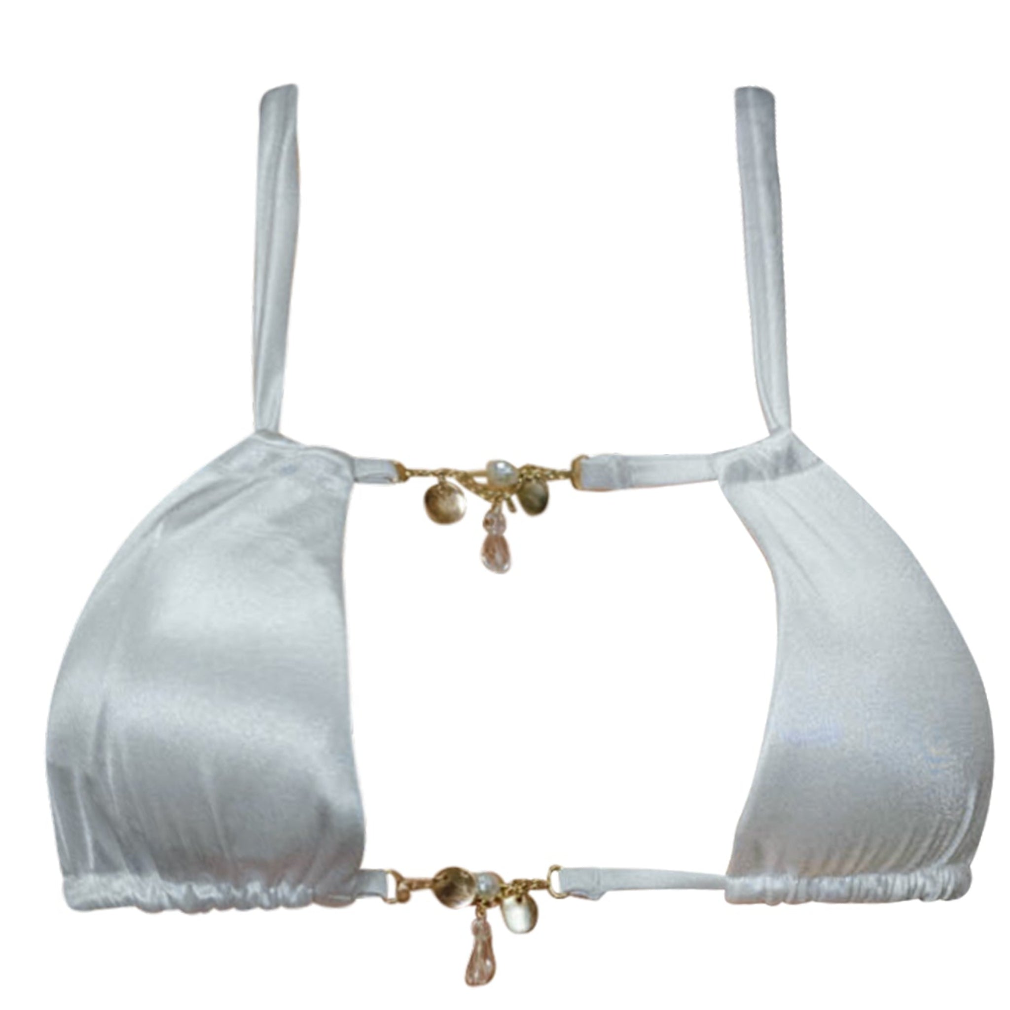 SELL WITH USSay hello to the ultimate showstopper — Faye is a luxurious satin halter bikini that brings elegance to the beach. With its glossy white finish and custom pearl-gold charm, this style was made to turn heads.