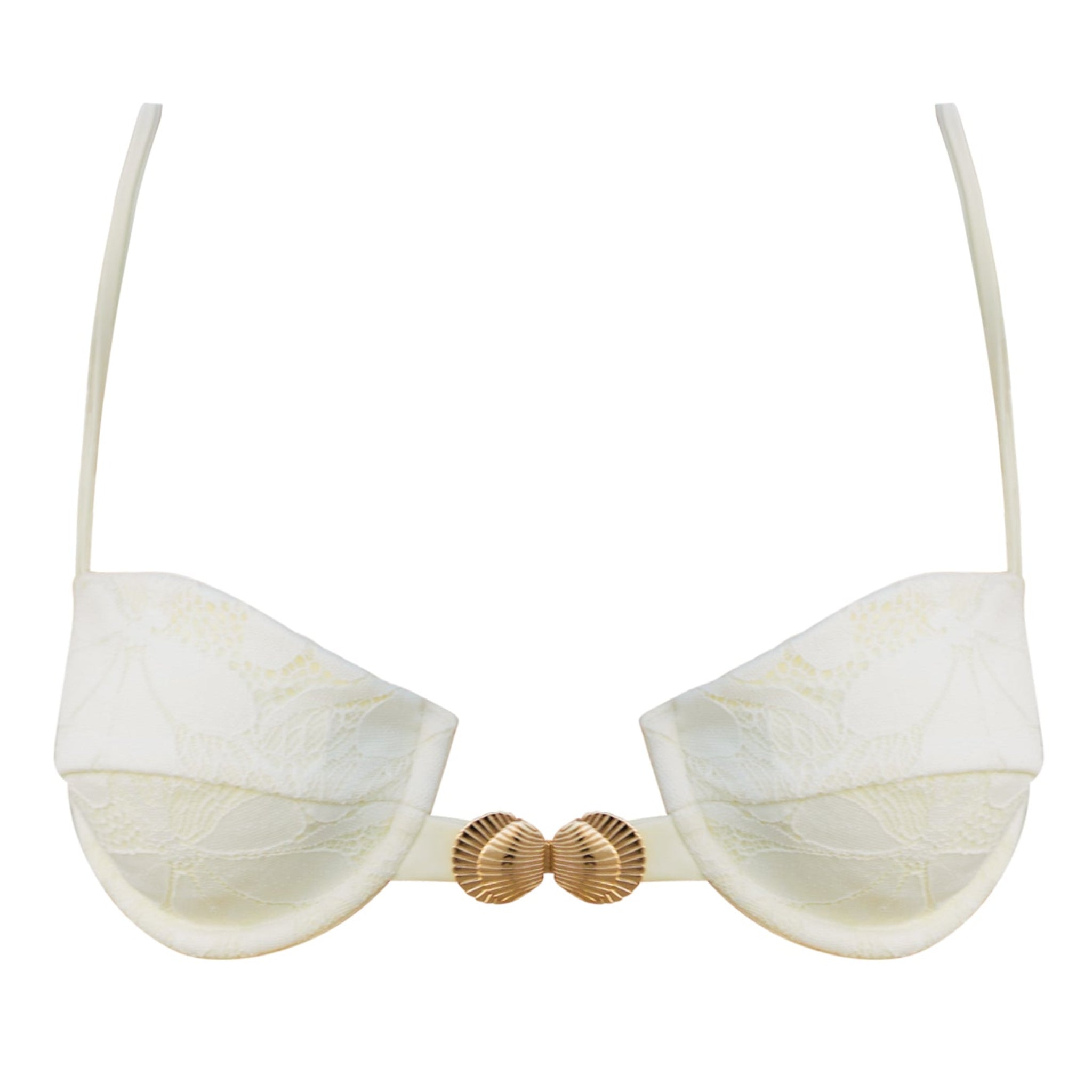 SELL WITH USA chic addition to your swimwear collection. The Hazel in Cream bikini is where style meets the sea. Designed with a cream lining and delicate white lace overlay, this dreamy set is adorned with a shell-shaped emblem at the center that unclasps. The wire cup top offers the perfect push-up effect.