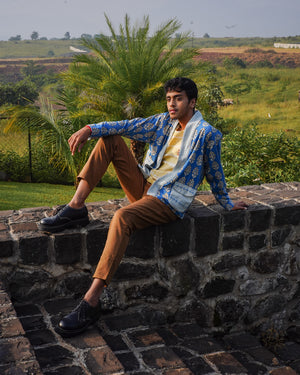 The Nadi Reversible Unisex Jacket is a one-of-a-kind piece featuring generation han-block prints and can be worn both ways! It is handmade with rainfed cotton and infuses the famous Bagh hand-block print with native motifs in natural plant colours. Soothing indigo handloom made with kala cotton make the embellishments. One side of the jacket features cool pockets, while the other highlights linear designs. The folded neck collar elevates the look and makes it a stylish and sustainable choice for a cozy day! The Nadi Jacket is designed to celebrate every body type, pair it with your favourite tops & experience wearing art! Limited edition, singular piece.