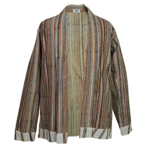 The Surajmukhi Unisex Jacket is curated in the most joyous colours just like its name. Whether it is a breezy autumn day or a cold winter morning, layer it for warmth and style. The stripes meet into angled patterns on the border for an opulent feel. It is made from pure rainfed cotton and coloured with natural plant dyes. Elevate your casual top and dresses with this limited edition jacket - designed to celebrate every body type.