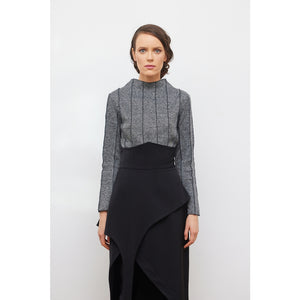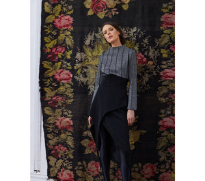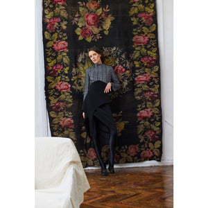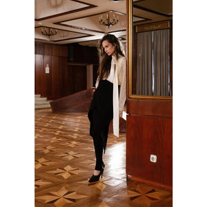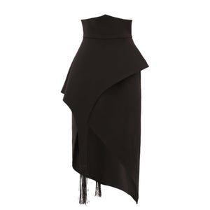 Make a bold statement with the Asymmetric Draped Skirt in Black. Designed in premium wool, this high-waisted skirt features dramatic fringe detailing and an elegant overlay that creates a sculptural, asymmetric silhouette. With a hidden back zipper and tailored fit, it’s the perfect black skirt for evening wear, cocktail parties, or fashion-forward formal events.